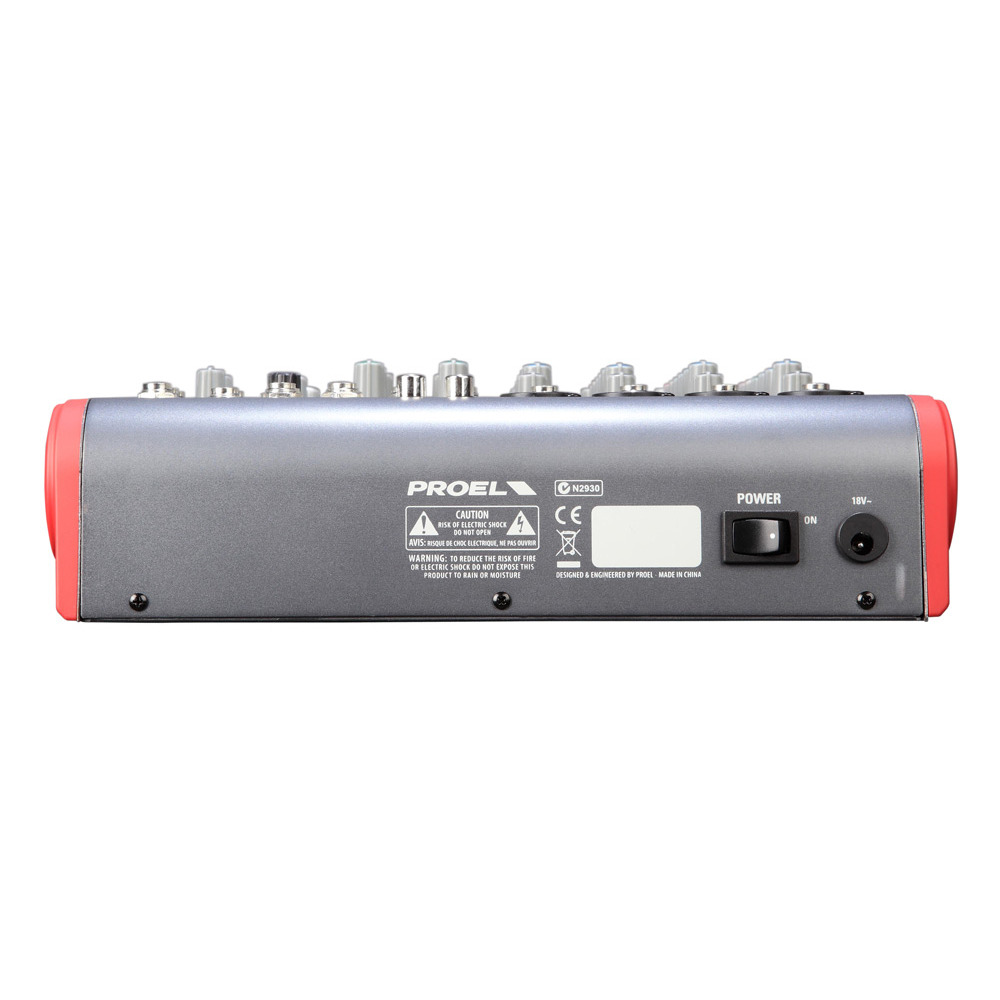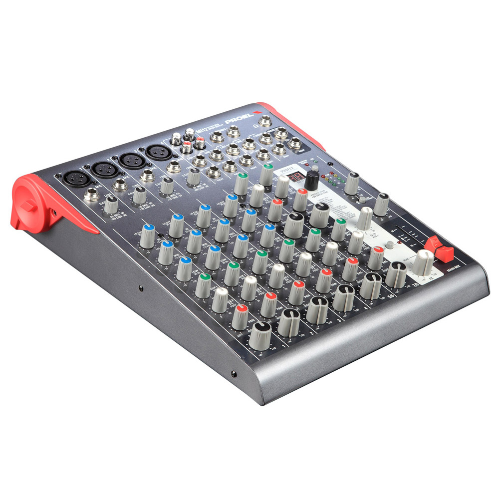 PROEL MI12 — компактный микшер 12 каналов, 2 шины, три тембра с параметрической серединой на каждом моно канале, DSP процессор, 3-полосный мастер эквалайзер, эффекты: 256 (16 пресетов x 16 вариаций). Входы: балансный XLR мама, балансный джек, выход: небалансный джек.