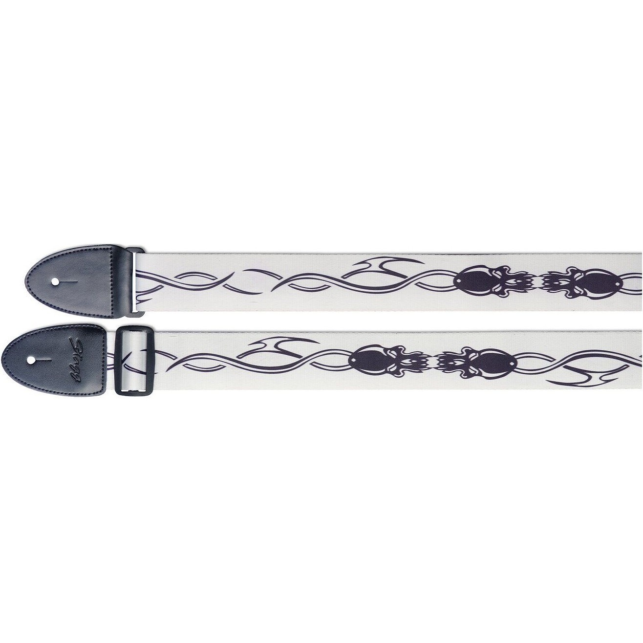 Первое что бросается в глаза при виде этого ремня для гитары - это яркость и четкость принта, а также его дизайн. Это обусловлено тем, что на материал, из которого он изготовлен, очень хорошо ложится краска. Рисунок не выцветает от попадания прямых солнечных лучей и стирок. Наконечники сделаны из крепкого заменителя кожи, который не трескается со временем.