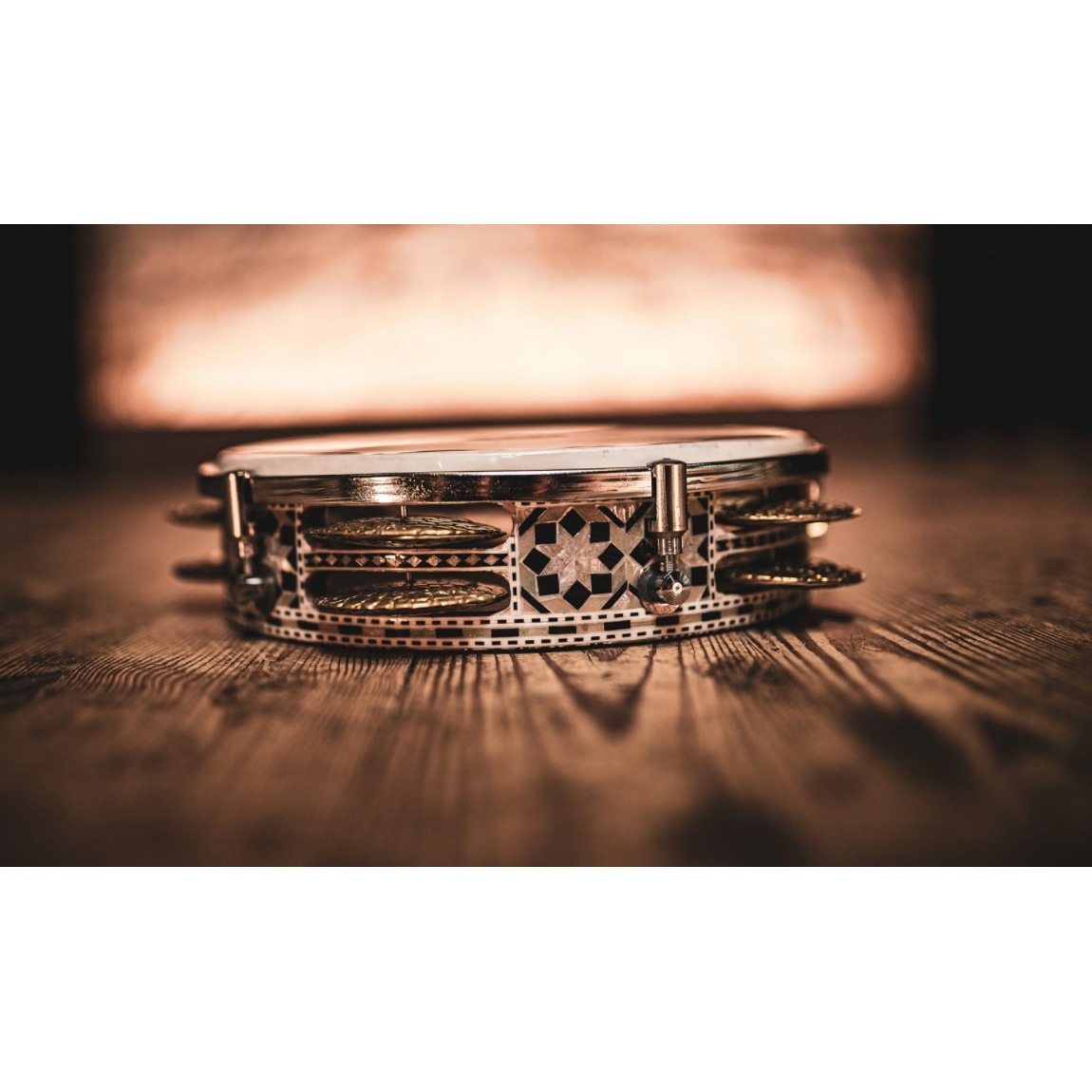 Фрейм барабан MEINL Artisan Edition White Burl Mosaic Royale Riq Drum 8 3/4" - этот барабан имеет выдающиеся традиционные звуки и внешний вид. Основанный на арабской народной и классической музыке, он состоит из десяти пар латунных бубенцов с особой текстурированной отделкой. Деревянный корпус отделан изысканным мотивом королевской мозаики. Синтетическая мембрана диаметром 8 3/4 дюйма крепится с помощью пяти регулировочных болтов и легкого алюминиевого обода. Эта мембрана имеет широкий динамический диапазон и может выдерживать настройки высокого напряжения.
