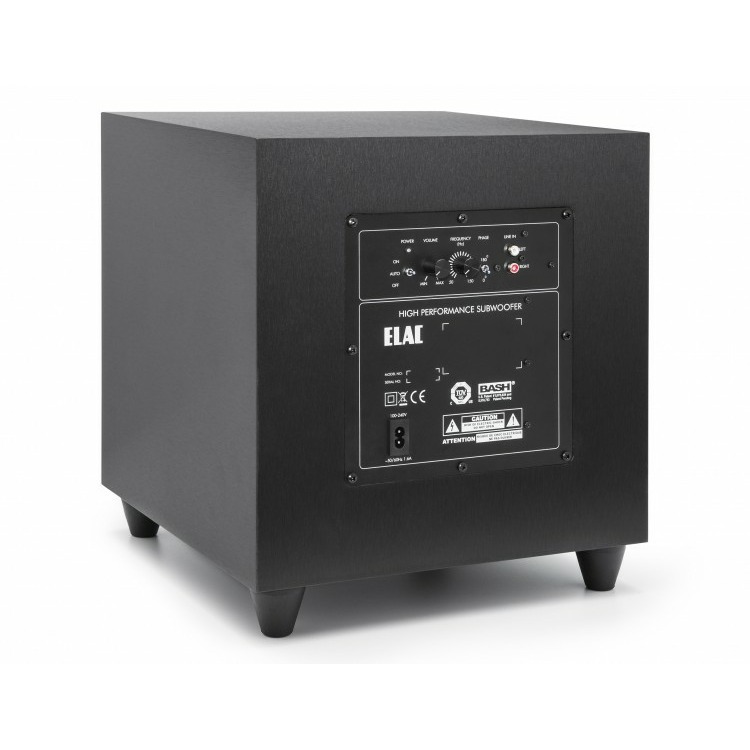Elac Debut S10 – активный сабвуфер фазоинверторного типа. Саб выполнен в компактном корпусе высотой всего 343 мм. Саб оборудован легированным бумажным 250-миллиметровым НЧ-динамиком, работающим в закрытом боксе, а также встроенным 100-ваттным усилителем BASH-Tracking (Bridged Amplifier Switching Hybryd), в котором объединены преимущества усилителей классов AB и D. На задней панели сабвуфера размещены органы настройки: плавные регулировки уровня громкости, частоты среза (50-150 Гц) и тумблер фазы (0-180 градусов), трехпозиционный тумблер режимов питания (вкл/выкл/экономичный с автоматическим обнаружением сигнала).