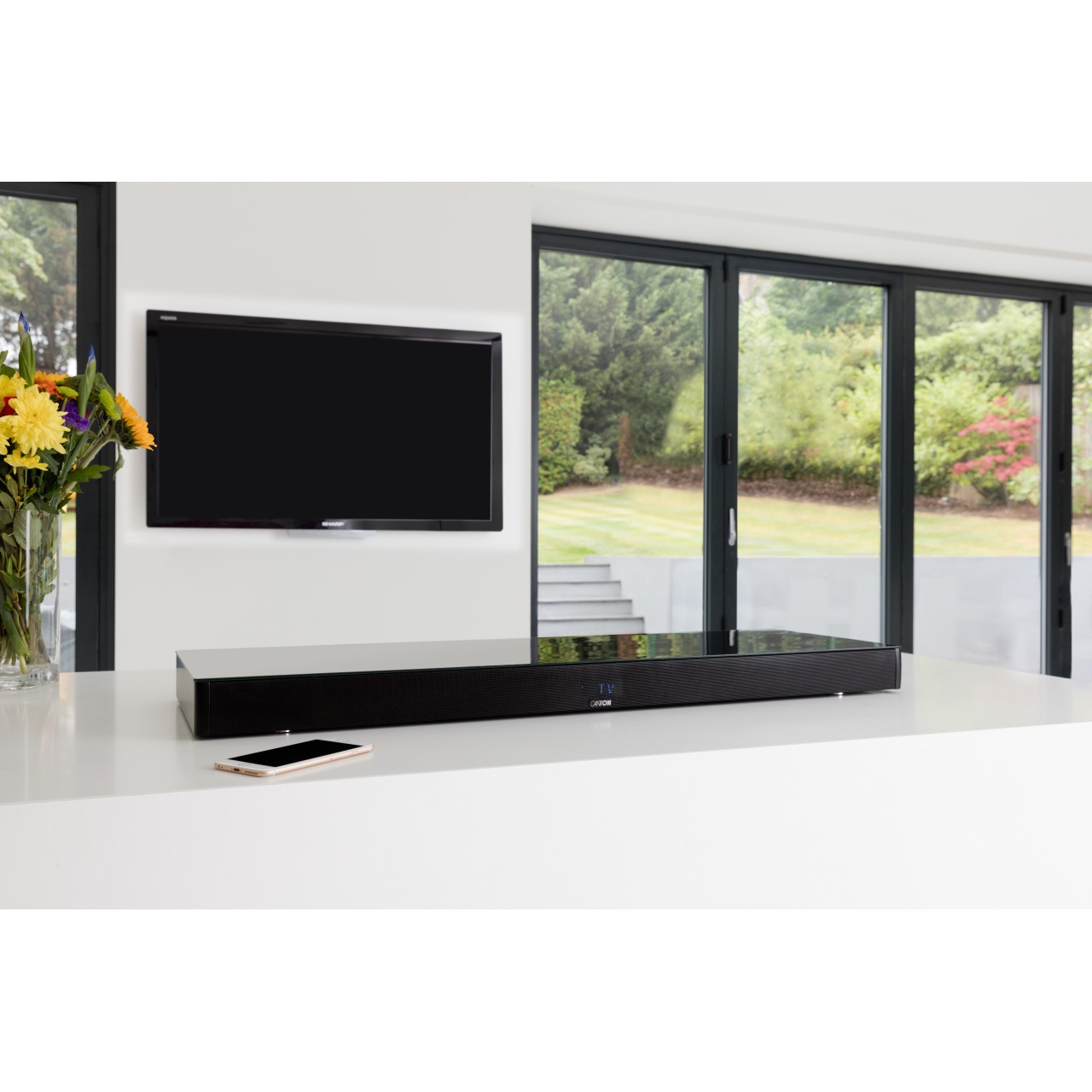 Одним нажатием кнопки Canton DM 76 оптимально адаптируется к месту установки. Также можно с пульта управлять басами и высокими частотами, что позволяет адаптировать звук к вашему вкусу. Многофункциональный дисплей кратковременно загорается при каждой команде, что позволяет безопасно управлять звуковой базой. Пульт Canton может запоминать и заменять инфракрасный код пульта ДУ телевизора. Кроме того, Canton DM 76 может управляться с пульта дистанционного управления телевизора. Виртуальная система объемного звучания позволяет задержке звукового сигнала компенсировать любую возможную асинхронность губ на экране телевизора.