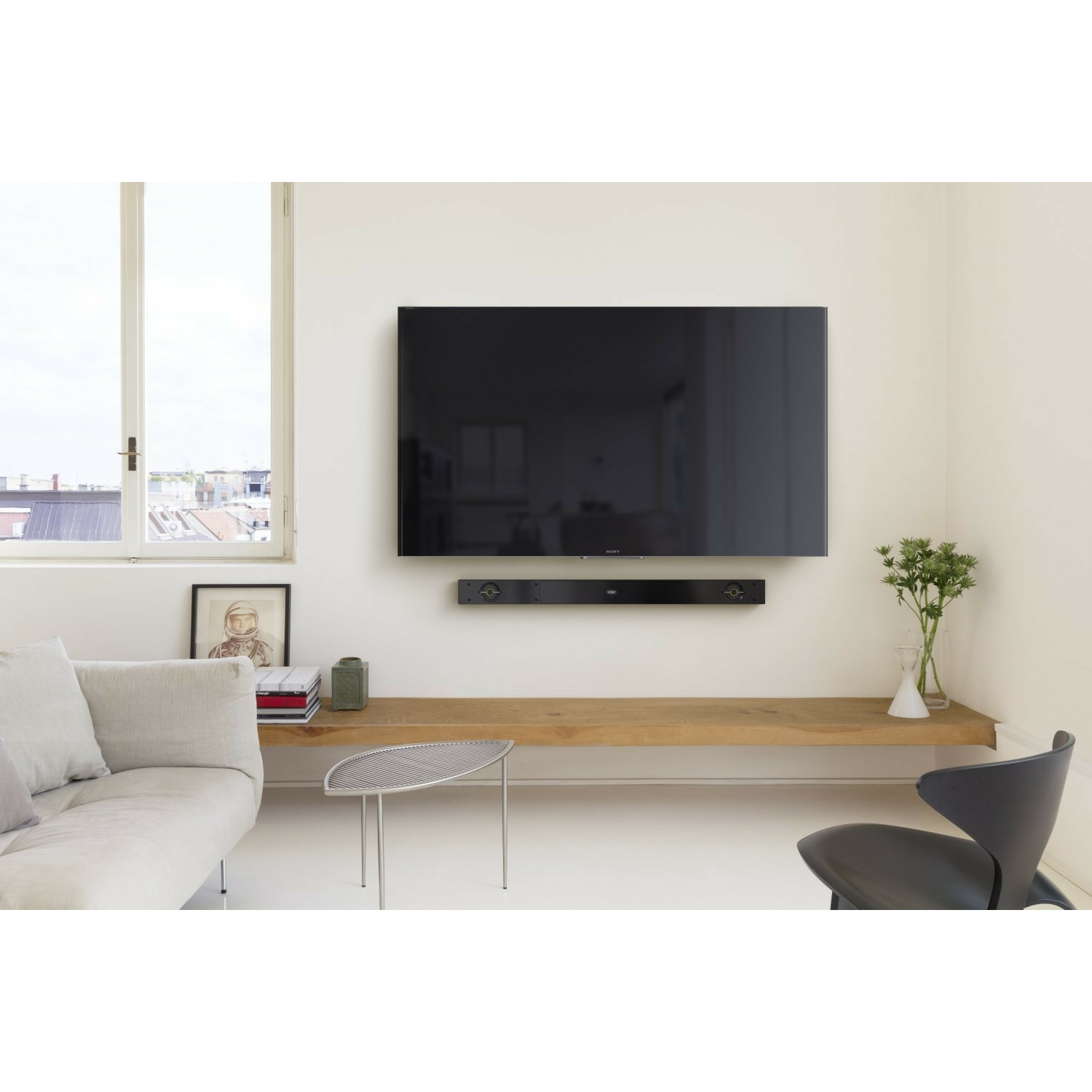 Размеры саундбара не превышают толщину плоскопанельного телевизора с большой диагональю, поэтому он органично смотрится на стене под телевизором или на столе, не отвлекая внимание от происходящего на экране.