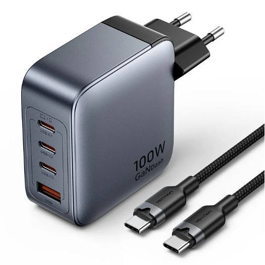 | - | Vention Зарядное устройство GaN с 4 портами USB (C + C + A + A) (100 Вт/100 Вт/30 Вт/30 Вт) серого цвета с кабелем USB-C - USB-C (1 м), черная вилка EU |