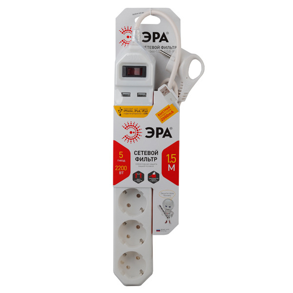 Сетевой фильтр ЭРА на несколько розеток совершенно необходим в каждом доме, полном электроприборов, он способен защитить их от скачков напряжения в электросети и короткого замыкания, продлив срок эксплуатации. С выключателем. Материал корпуса: полипропилен. Сечение провода: 3x0.75мм2 соответствует ГОСТу. Блок фильтрации - защита от импульсных помех. Терморазмыкатель на 10А - защита от перегрузки. 2 порта USB для подзарядки мобильных устройств.