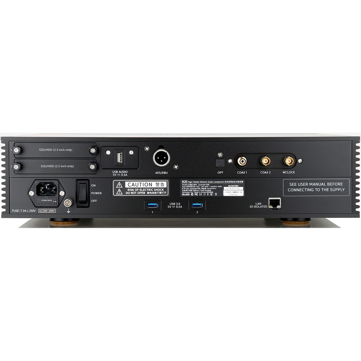 Предтоповый проигрыватель Aurender N20 4Tb, сочетающий в себе функции аудиофильского стримера и сервера, оборудован двумя слотами для 2,5-дюймовых дисков HDD и SSD. Суммарный объем такого хранилища может достигать 16 ТБ (при установке двух накопителей по 8 ТБ). В данной версии на борту имеется HDD объемом в 4 ТБ. Аппарат оснащается SSD-буфером на 500 ГБ для кэширования аудиофайлов перед воспроизведением, что позволяет увеличить срок службы HDD, уходящего в «спящий» режим сразу после передачи данных в кэш. При этом минимизируются шумы, связанные с работой жесткого диска.