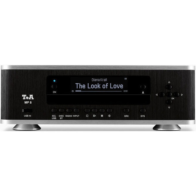 Модель T+A MP 8 из серии Series 8 — это не только классический CD-проигрыватель, но и настоящий цифровой универсал, включающий в себя качественный тюнер (FM, FM-HD и DAB+), Bluetooth с поддержкой кодека aptX и потоковый клиент SCL (стример) с поддержкой UPnP-протокола. Стример способен «тянуть» из локальной сети Hi-Res-файлы в разрешении 24 бит/192 кГц при LAN- или WLAN-подключении. При этом открывается доступ к Интернет-сервисам (Tidal, Deezer, Qobuz) и веб-радио. Имеется сертификация Roon Ready, позволяющая использовать приложение Roon для организации каталога всех аудиофайлов (включая информацию об исполнителях), хранящихся на домашних серверах. В модели используется мощный DSP, однако производитель акцентирует внимание на том, что данное устройство — это не просто «повторитель» функций компьютера, а полноценный цифровой аудиофильский аппарат, предназначенный для работы с внешним ЦАПом.