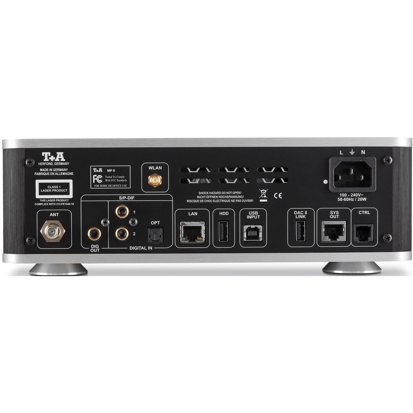 На тыльной панели имеется набор S/PDIF-входов, LAN-порт, еще один USB для HDD, флешек и прочих накопителей. Имеется вход USB (тип B) для сквозного подключения компьютеров PC и Mac при использовании проигрывателя в тандеме с внешним ЦАПом DAC 8 DSD. В таком случае проигрыватель соединяется с ЦАПом через USB-выход DAC 8 Link и сервисный интерфейс SYS Out. Присутствует один коаксиальный выход с минимальным джиттером для подключения к любому внешнему цифро-аналоговому конвертеру. Для управления моделью можно использовать штатный пульт, приложение T+A для iOS и Android, а также приложение Roon.