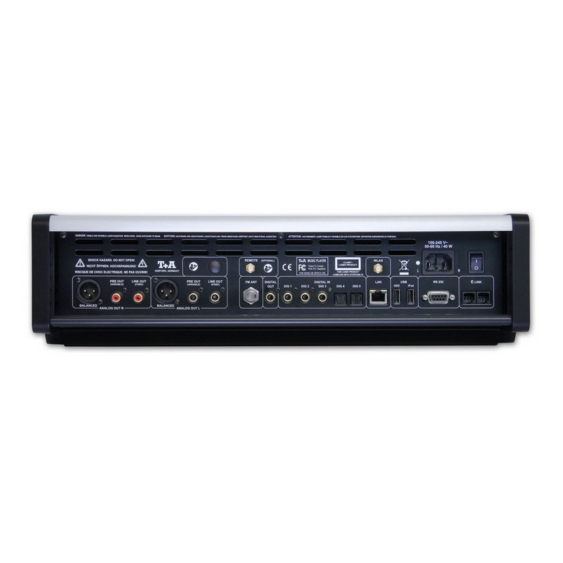На тыльной стенке T+A Music Player Balanced есть практически вся необходимая на сегодняшний день коммутация: балансный выход XLR, аналоговый Pre Out (для предусилителя, доступного в качестве опции) и фиксированный линейный выход RCA. Из цифровых соединений имеется один коаксиальный выходной разъем, и три коаксиальных (поддерживают частоту дискретизации в 192 кГц) и два оптических (96 кГц) входа. Присутствуют интерфейсы LAN (для локальной сети и потоковых файлов из Интернета) и RS-232 (для управления плеером и обновления его прошивки), а также гнезда антенны WLAN (для беспроводной передачи данных по сети Wi-Fi) и обычной антенны FM. Есть два порта USB: для iPod и жесткого диска. С помощью системной шины E Link можно подсоединить другие компоненты серии E. Сокет Remote позволяет опционально использовать внешний передающий модуль для радиоуправления проигрывателем посредством отдельного фирменного пульта FD100 с цветным TFT-дисплеем (не путать с идущим в комплекте обычным пультом ДУ). Опционально в аппарат можно встроить предусилитель, который даст возможность подключиться к оконечнику и регулировать тембры и громкость прямо в проигрывателе.