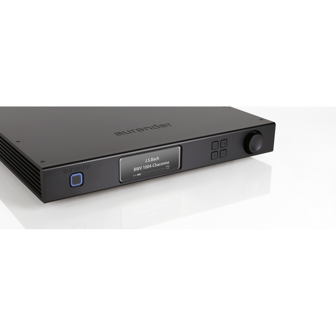 Сетевой проигрыватель Aurender A10 оснащен жестким диском объемом в 4 ТБ и может использоваться в качестве полноценного музыкального сервера. Модель собрана в низкопрофильном алюминиевом корпусе, оснащена дисплеем AMOLED и ручкой для настройки громкости. Хороший запас буферной SSD-памяти (кэша) в 120 ГБ позволяет уменьшить износ HDD и понизить уровень шумов, так как после кэширования аудиофайлов «хард»-диск уходит в спящий режим.