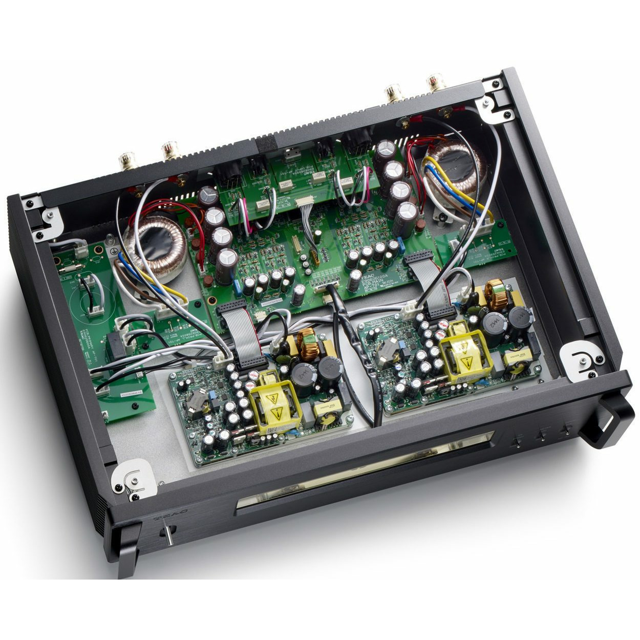 Teac AP-701 – это новый флагманский стерео усилитель мощности, реализующий все элементы, необходимые для усиления сигналов на самом высоком уровне и задающий новый уровень совершенства. Оснащенный двумя независимыми мощными силовыми трансформаторами с тороидальными сердечниками – для левого и для правого каналов, буферными усилителями на дискретных элементах и двумя модулями Ncore, он имеет архитектуру типа «двойное моно» от входа до выхода. Входные цепи полностью балансные, так что вся динамика исходных аудио записей полностью передается на акустические системы, максимизируя качество звука. Корпус усилителя изготовлен из массивных алюминиевых панелей толщиной 3 мм, но имеет при этом гибкую структуру, позволяющую контролировать вибрации. На стыках панелей используются шарнирные подвесы для управления вибрациями всего устройства, чтобы обеспечить открытое и полное жизни воспроизведение звука.