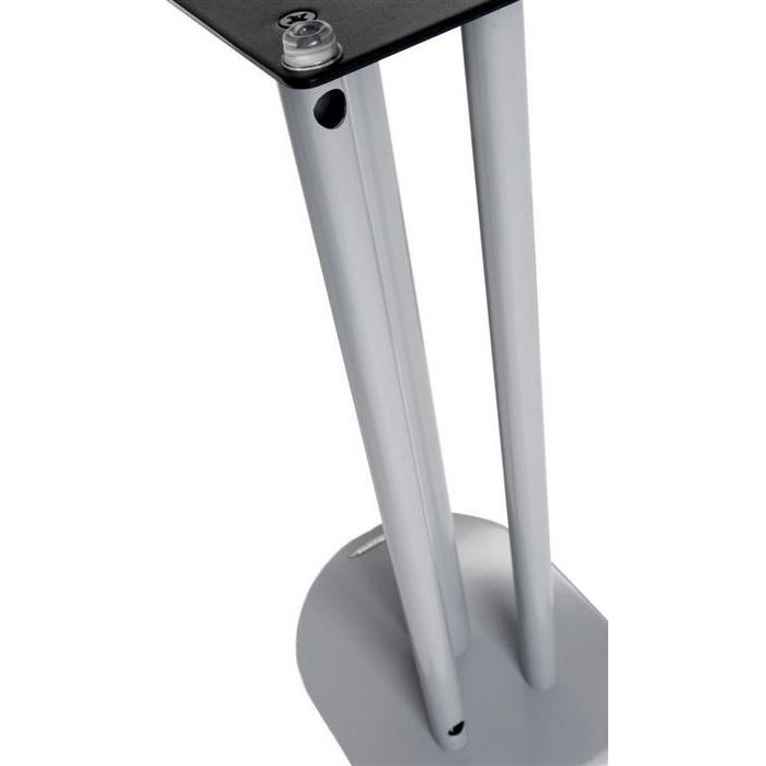 Трехтрубная конструкция The Nexus по внешним признакам обещает очень высокую жесткость. К нижнему основанию крепятся все три штанги. В 50-миллиметровой трубе на торцевой части есть щели (около 10 мм), через которые внутрь можно засыпать балласт. Маленькие стальные трубы (диаметр 28 мм, толщина стенки 1,5 мм) с торцов заварены, и засыпку можно осуществлять разве что через резьбовое отверстие. Скрепляется вся конструкция мощными винтами М8. Для сборки требуются большие отвертки—и плоская, и крестовая (в комплекте инструмента нет). Верхняя полка выполнена из 4-миллиметровой стальной пластины, нижняя — штампованная из 2-мм стали. Снизу — два короба с резьбовыми отверстиями для ножек-шипов. Кстати, для затяжки контргаек также придется самому поискать ключ. Шипы имеют длинную резьбовую часть, но вкручиваются не полностью, упираясь в пластину основания. В результате минимальное расстояние от пола до низа основания составляет около 25 мм. Для верхней полки (столик под колонку) не преду- смотрено никаких прокладок или шипов. Просто ставить колонку без прокладок мы бы не советовали, поэтому решать сию проблему можно с помощью самодельных или покупных прокладок. Стойка может служить и в бюджетной, и в роскошной стереосистеме. В последнем случае, конечно, желательно использовать балластную засыпку (удобнее — дробь).