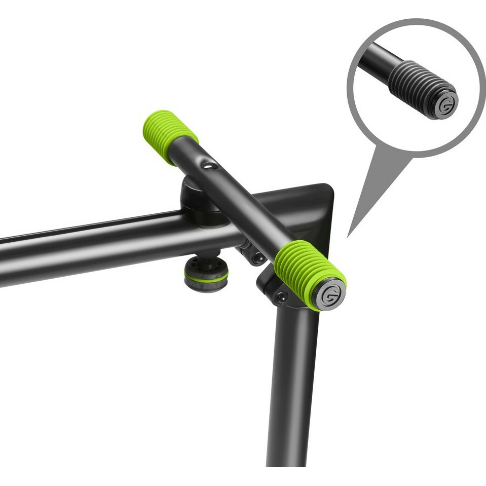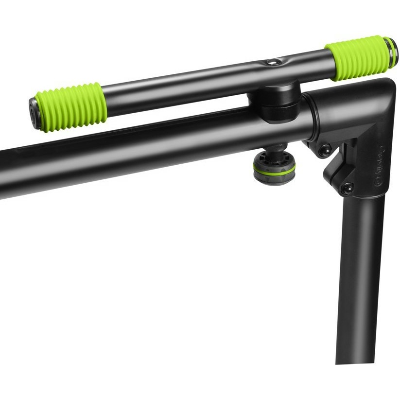 Верхние упоры могут быть отрегулированы по ширине клавиатуры, а также могут быть наклонены небольшими шагами в диапазоне 360 градусов. В целом, эта прочная стальная конструкция включает в себя все возможности, которые возможны в такой конструкции без компромиссов. При транспортировке обе ноги и верхний упор могут быть сложены внутрь, что обеспечивает очень компактную высоту транспортировки.
