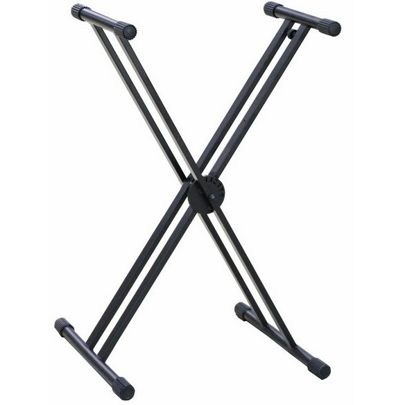 OnStage KS7591 (brown box) – X-образная стойка для клавишных. Имея двойную раму из стали, способна выдержать до 50 кг нагрузки. Ребристые держатели позволяют надежно удерживать инструмент на месте, а ножки делают конструкцию устойчивой. Предусмотрена система регулировки для фиксации высоты в нескольких положениях. Также можно сложить стойку полностью для транспортировки.