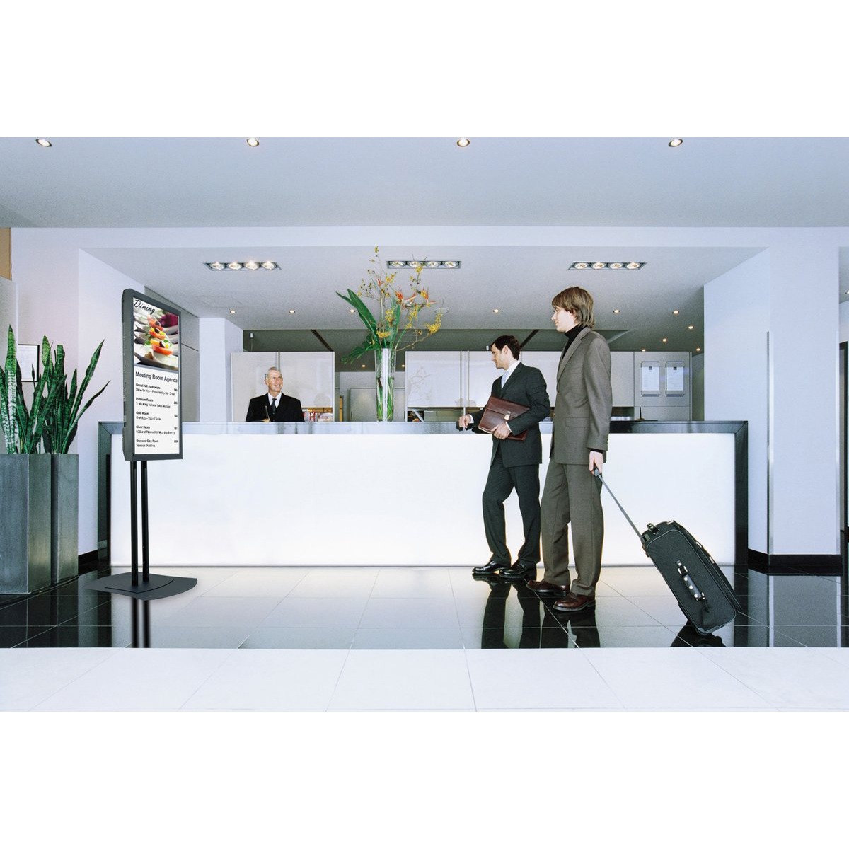 - Напольная стойка с тяжелым устойчивым основанием позволяет разместить до четырех панелей с диагональю экрана 70″