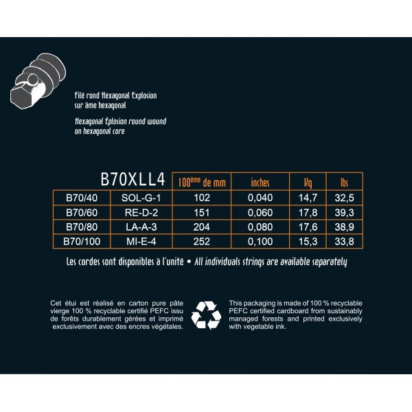 Струны для бас-гитары Hexagonal Explosion представляют собой оплетку из никелированного металла на стальной шестигранной основе. Они максимально оптимизируют определенные качества и ощущения, которые вы получаете от струн с шестигранным сердечником: точный отклик, быструю проекцию и мощный звук. Особое внимание было уделено гибкости и эластичности струн, чтобы сделать игру легкой и комфортной.