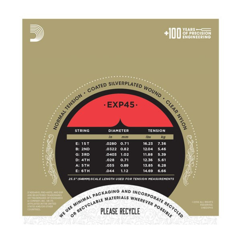 Посеребренная медная обмотка струны дополняется сверхтонким покрытием EXP, которое наносится на многоволоконный сердечник. В результате струна приобретает антикоррозионные свойства, препятствующие износу и коррозии, которые могут сокращать продолжительность эксплуатации и ухудшать звук. Классические струны серии EXP с круглой обмоткой из посеребренной меди обладают естественным, свежим и ярким звуком, и «новое звучание струн» длится в три раза дольше, чем у традиционных струн для гитары.
