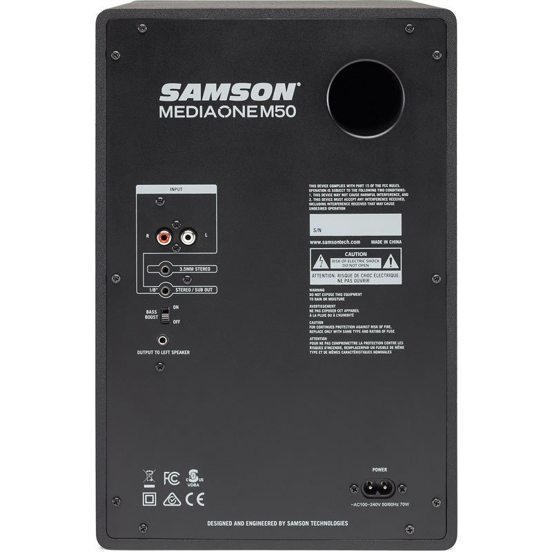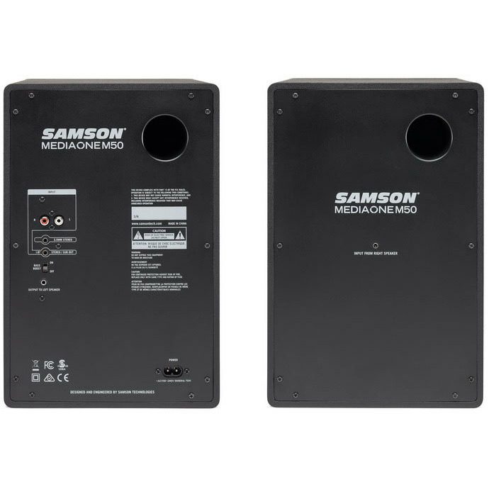 Samson MediaOne M50 оснащаются 5.2" полипропиленовыми вуферами и 0.75" твитерами с шелковым куполом. Твитеры помещены в волноводы, спроектированные для передачи широкой звуковой сцены. Мониторы поставляются стереопарой, в которой одна из колонок пассивная, а вторая оснащена усилителем и выступает в качестве "мастера". Усилитель работает в A / B классе и обеспечивает мощность в 40 Вт на каждый канал.