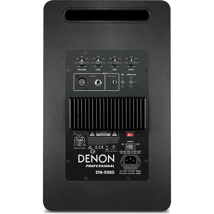 Denon DN-508S – трёхполосный активный студийный двухполосной монитор ближнего поля профессионального уровня, предназначенный для применения в самых разных ситуациях со сложной конфигурацией помещения. В нем реализована схема тройного усиления (tri-amp), при которой отдельно обрабатываются потоки для нижних, средних и верхних частот. Усилители класса A/B дают в сумме до 220 Вт мощности.