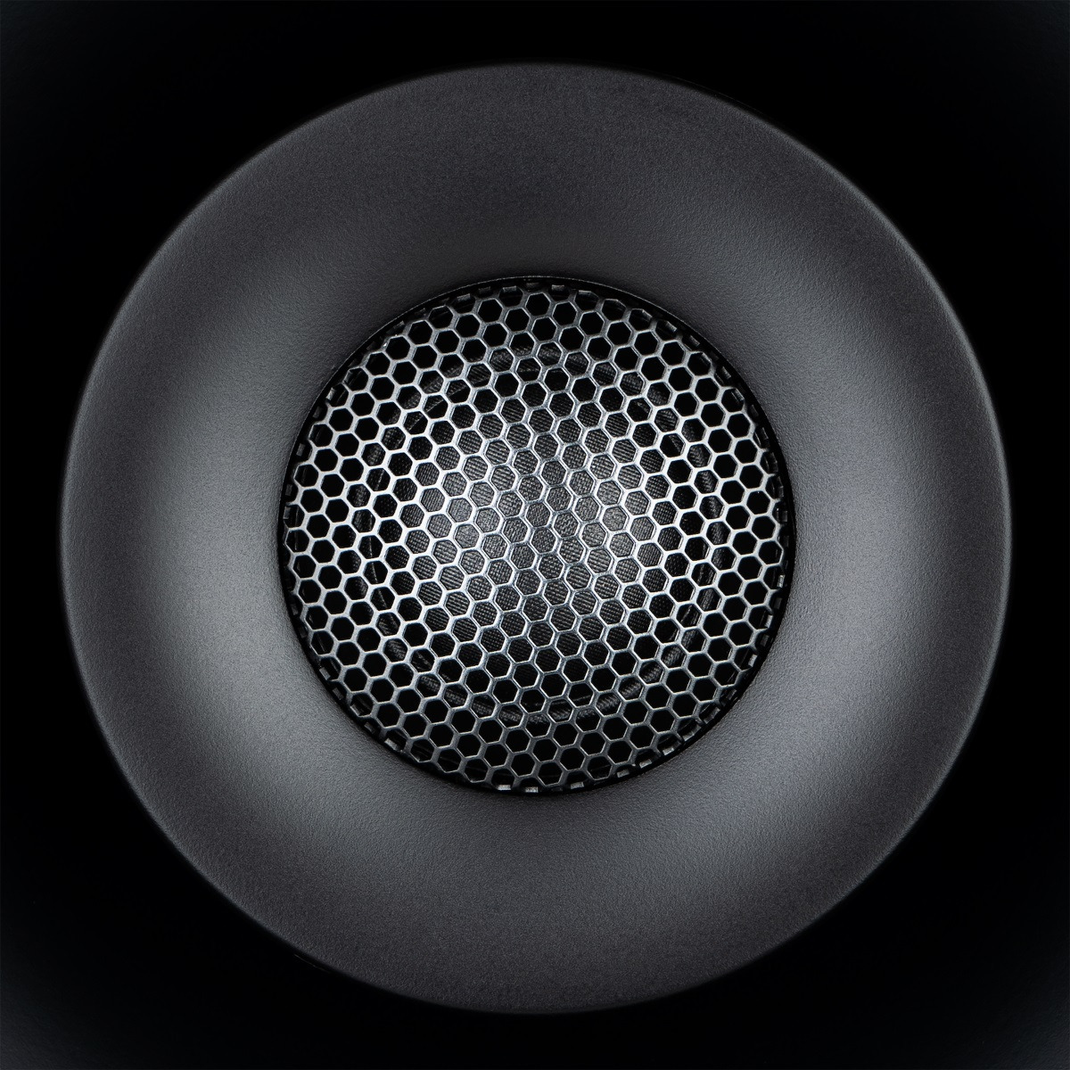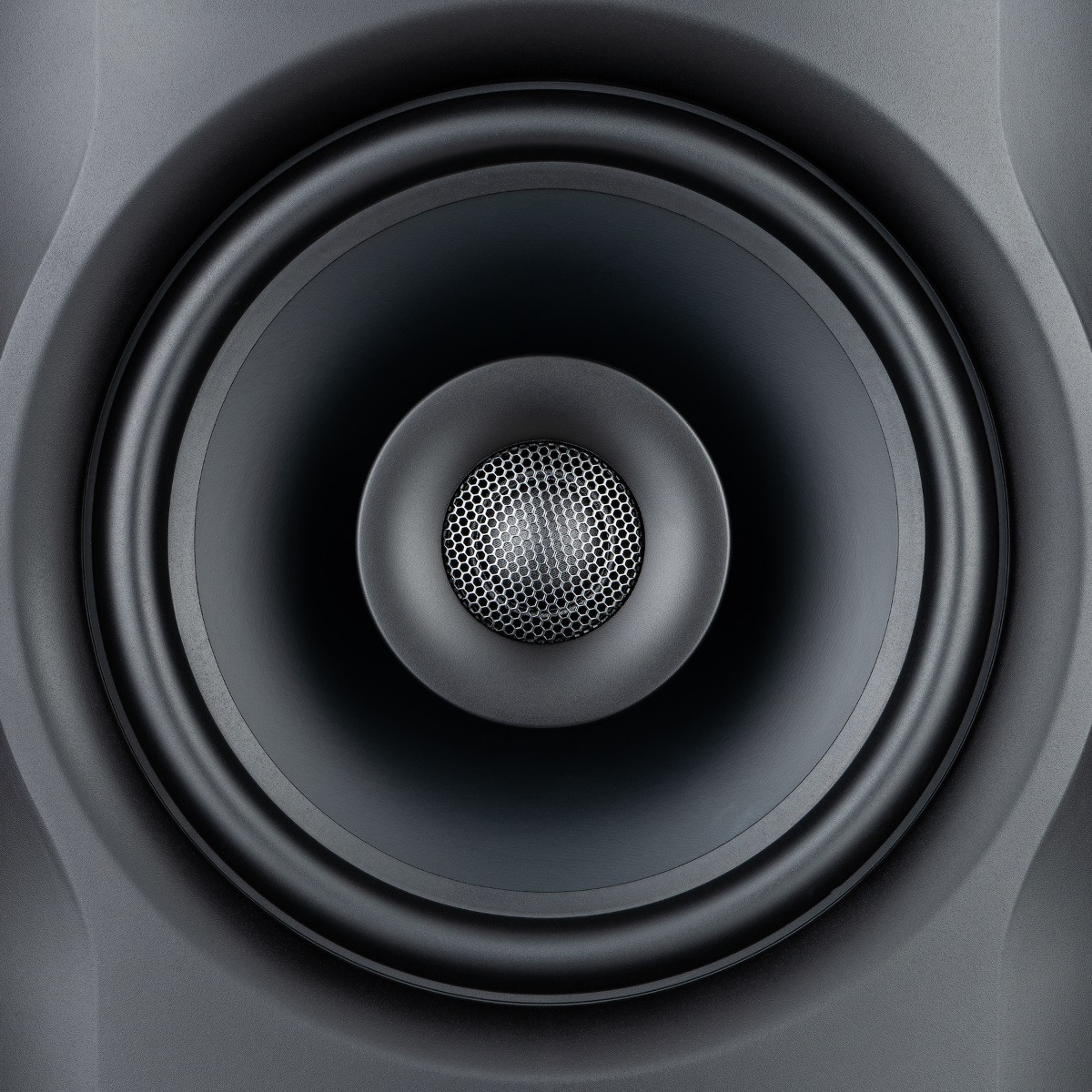 В центре вуфера размещен 25 мм шелковый купольный твиттер в коаксиальной конфигурации. Использование этой технологии (уникально для данной ценовой категории» превращает монитор в «точечный» источник, то есть, весь звук излучается из одной точки, а не из двух, разнесенных на 25 см. Это критически важно для улучшения характеристик вне оси, а также позволяет сделать монитор более компактным.