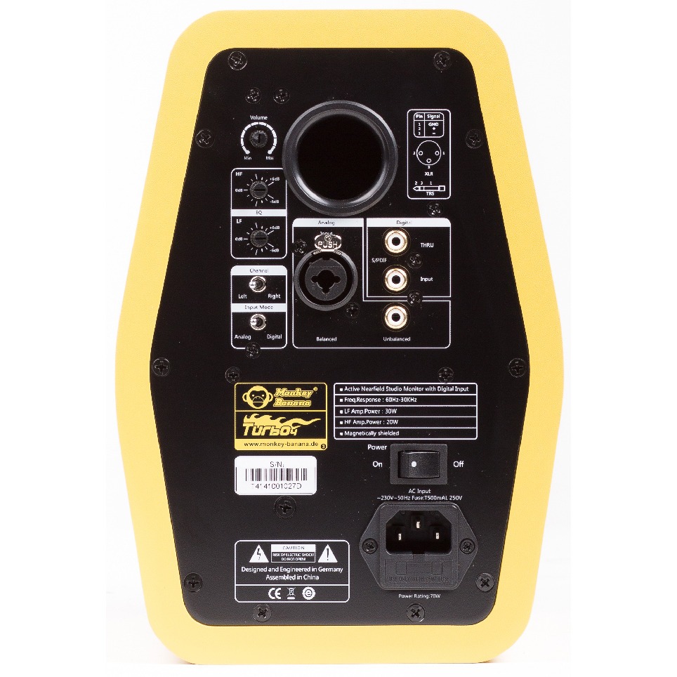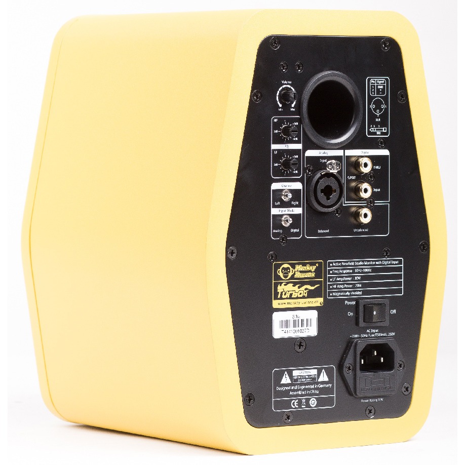Студийный монитор Monkey Banana Turbo 4 Banana - это новинка на рынке от немецких инженеров. Яркий дизайн и высокие характеристики уже стремительно завоевывают любовь музыкантов по всему миру. Они сравнимы с топовыми моделями других брендов в той же ценовой категории. Корпус сделан из МДФ в виде вытянутого шестиугольника, такой дизайн по заявлению производителя обеспечивает наилучшее расширение басов. Корпус дает правильное демпфирование вибраций от драйвера, а трансформатор спроектирован таким образом, чтобы уменьшить вибрации, шум, утечки магнитного потока и электромагнитных помех.