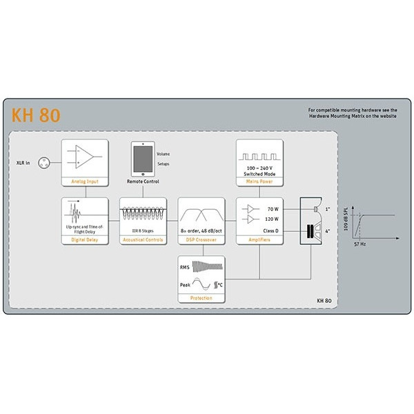 Цифровое ядро КН 80 DSP предоставляет функции фильтрации и возможности настройки под помещение, которые приносят воспроизведение звука референсного уровня в любую среду. Даже при своем компактном дизайне он обладает исключительной резервной мощностью, а также классическими достоинствами философии мониторов Neumann: четко определенным углом рассеивания, конструкцией без искажений и продуманным выбором материалов.
