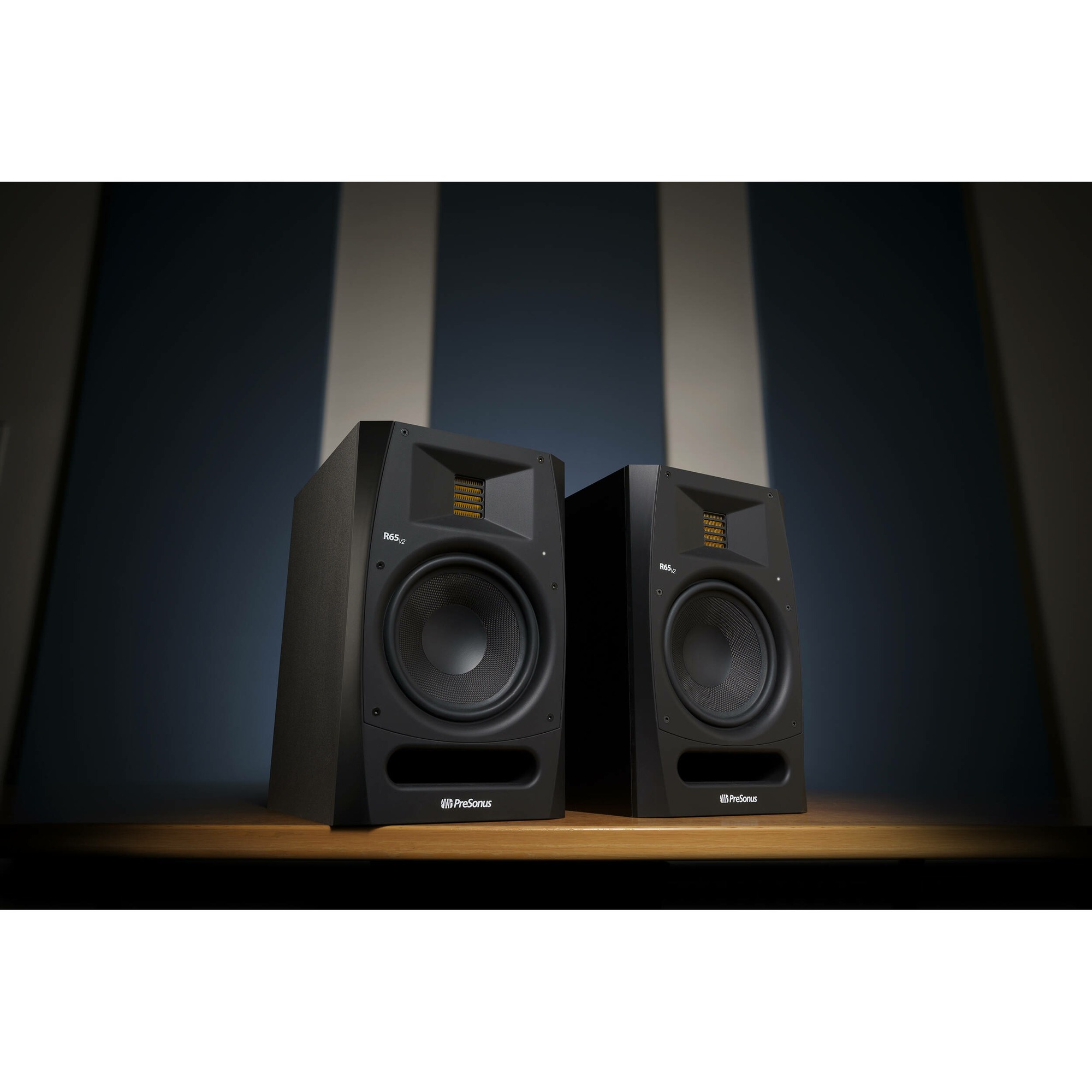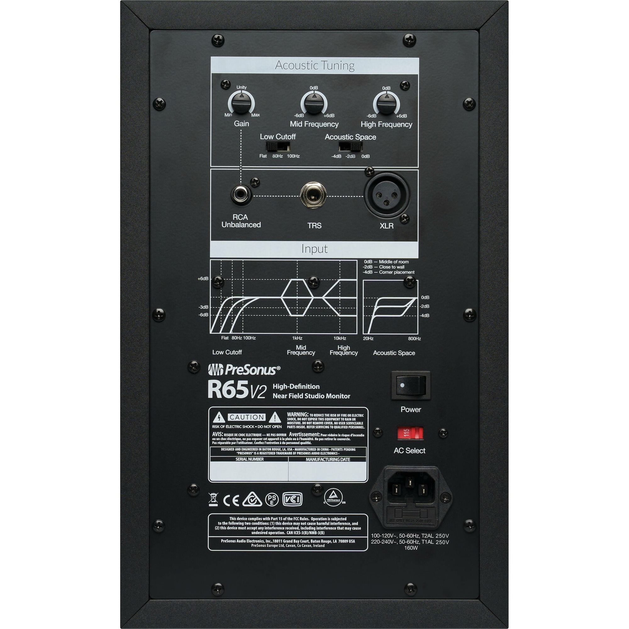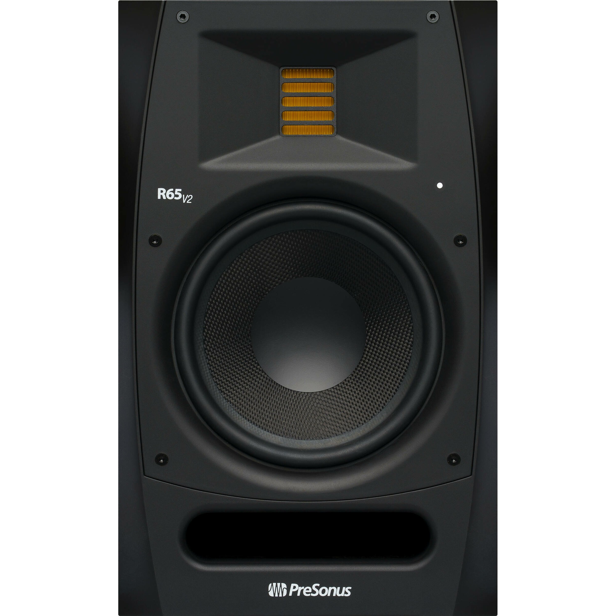 R65 V2 имеет ленточный AMT твитер обладающий сверхнизким уровнем искажений и эффективной переходной частотной характеристикой. В добавок с этим, монитор располагает НЧ динамиком 6,5” c кевларовым диффузором и включённой защитой от радиочастотных помех, перегрева, лимитером выходного тока и фильтром инфранизких частот. Коммутационные возможности представлены в виде двух балансных входов XLR/TRS и одного небалансного RCA.
