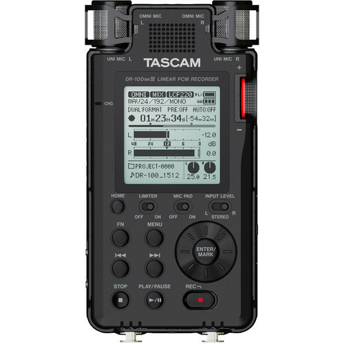 Как и DR-100MKII, обновлённый рекордер оборудован 4-мя встроенными конденсаторными микрофонами: двумя направленными и двумя ненаправленными. При этом направленные микрофоны в DR-100MKIII имеют антишоковый подвес для снижения эксплуатационных шумов. Также новинка может похвастаться возможностью записи в режиме 24 бит/192 кГц, более качественными предусилителями HDDA с низким уровнем шума (EIN = -124 dBu) и аналого-цифровыми конвертерами AK4558 от AKM, обеспечивающими соотношение сигнал/шум не менее 102 дБ (в режиме Dual ADC параметр SNR достигает значения 109 дБ). Ещё одним важным преимуществом Tascam DR-100MKIII является наличие комбинированных входов Mic/Line, реализованных на разъёмах производства компании Amphenol.