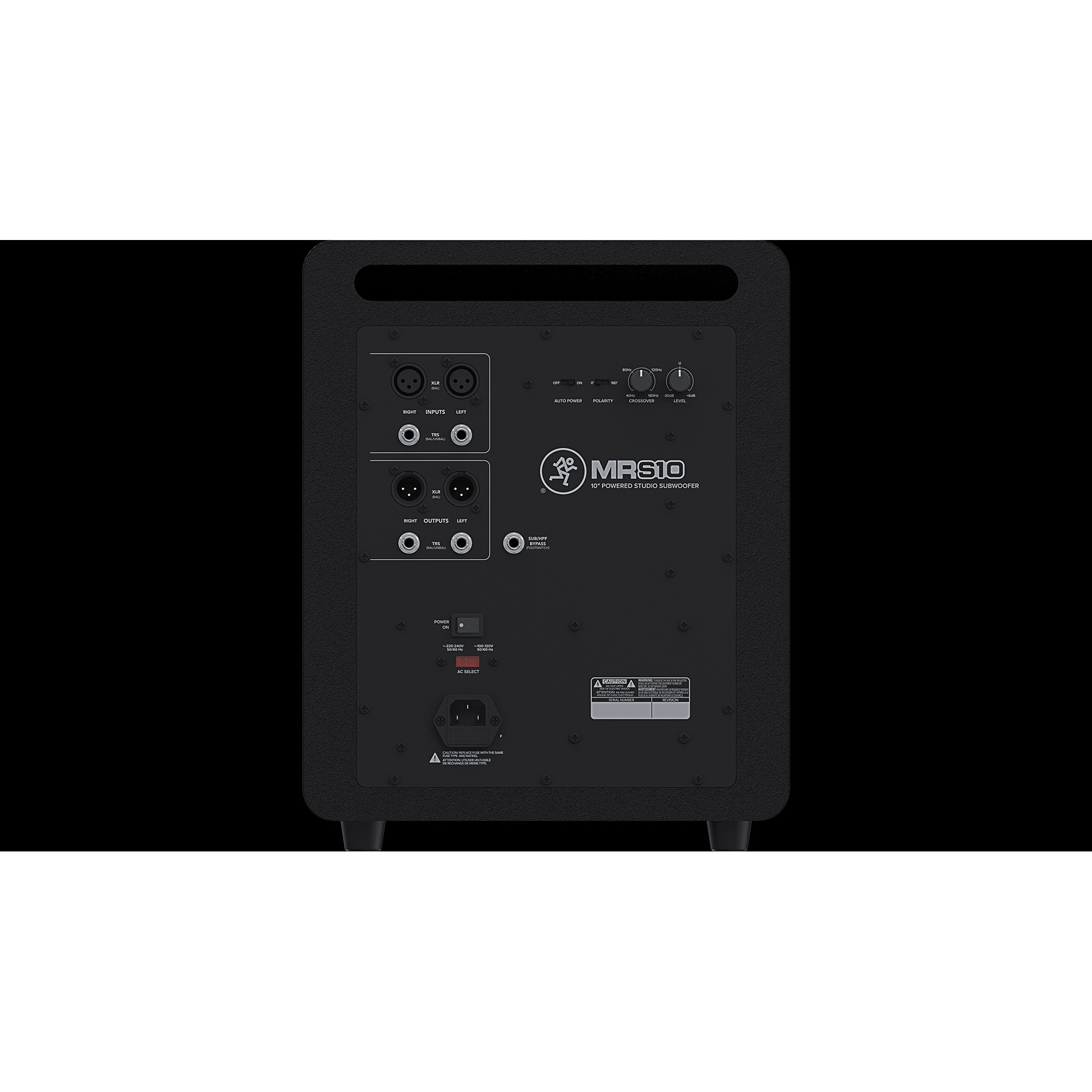 Сабвуфер MACKIE MRS10 имеет 10-дюймовый динамик с армированным стекловолокном диффузором и 120-ваттный усилитель класса D. Корпус сабвуфера, как и кабинеты мониторов, изготовлен из плит MDF, а коммутационные возможности представлены двумя парами входов и сквозных выходов. Также в MACKIE MRS10 предусмотрено отдельное гнездо для футсвитча, с помощью которого можно пустить сигнал на мониторы в обход сабвуфера.