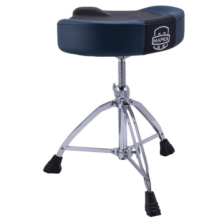 Стул Mapex T855BL с мото-сиденьем из дышащего винила чёрного цвета с синими вставками. Он имеет ось с резьбой и устойчивые двойные ножки. Этот стул идеально подходит для музыкантов, обеспечивая комфорт и надёжность во время игры.