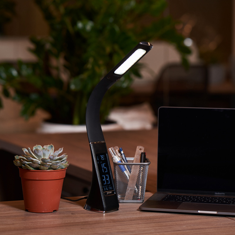 Настольный диммируемый светильник REXANT Cesar идеально подходит в качестве прикроватного светильника благодаря оптимальному мягкому свету, лаконичному дизайну и встроенному будильнику. Светильник с цветовой температурой 4000 К оснащен цифровым дисплеем, отображающим дату, время, температуру в помещении и день недели. Яркость встроенного дисплея регулируется на несколько уровней, создавая комфортную атмосферу. Декорирован специальным материалом софт-скин с эффектом тиснения кожи. Светильники REXANT – это высокое качество освещения по приятной цене. Тип источника света: LED Световой поток: 450 Лм Мощность светильника: 8 Вт Индекс цветопередачи (CRI): >80 Коррелированная цветовая температура основного света (в сфере): 4000 К Цветовая температура ночника: синий Переменный/постоянный ток (AC/DC): АС Диммирование: встроенный Напряжение питания: 220 В Класс защиты от поражения током: II Температурный режим: +5...+40 °С Цвет корпуса: черный Коэффициент пульсации: <5% Степень защиты: IP20 Класс энергоэффективности: A КСС Д Материал корпуса: ABS пластик Материал рассеивателя: светопропускающий полимер Тип крепления: на основании Размеры: 521х60х88 мм