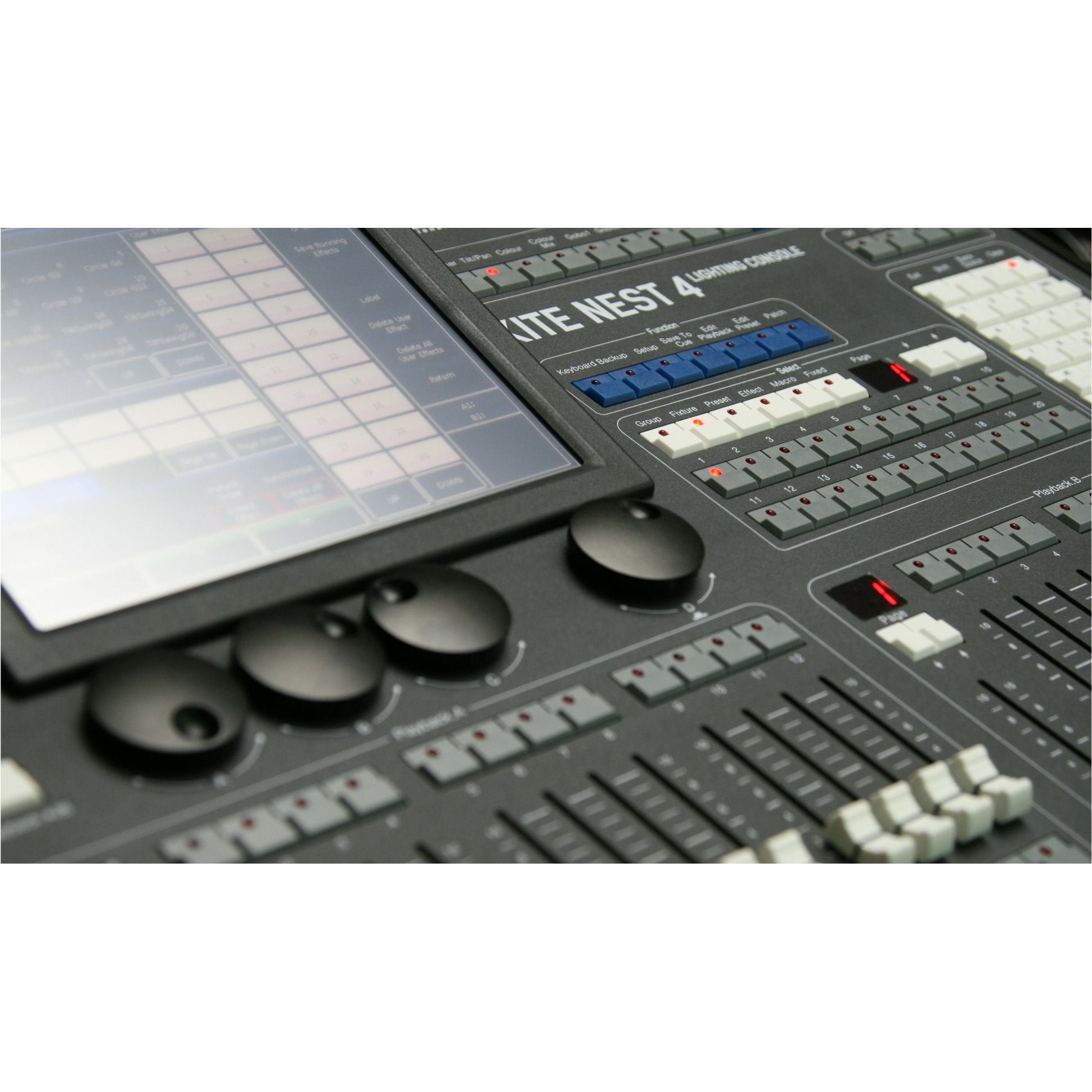 Профессиональная консоль управления светом в компактном корпусе, сочетает в себе широкие возможности программирования световых шоу. NEST4 обладает возможностями и функциями современных технологий, применяемых в системах управления светом лидерами рынка. В одном устройстве совмещены сразу нескольких пультов, обычно используемых в этом классе. Не нужно отдельно докупать крыло фейдеров, отдельный монитор с тач-скрином, туровый кейс, миди кабель, подсветку – все есть в базовом комплекте поставки. Пульт управляет 2-мя полными потоками DMX-512, что удовлетворяет требованиям большинства средних объектов шоу индустрии.