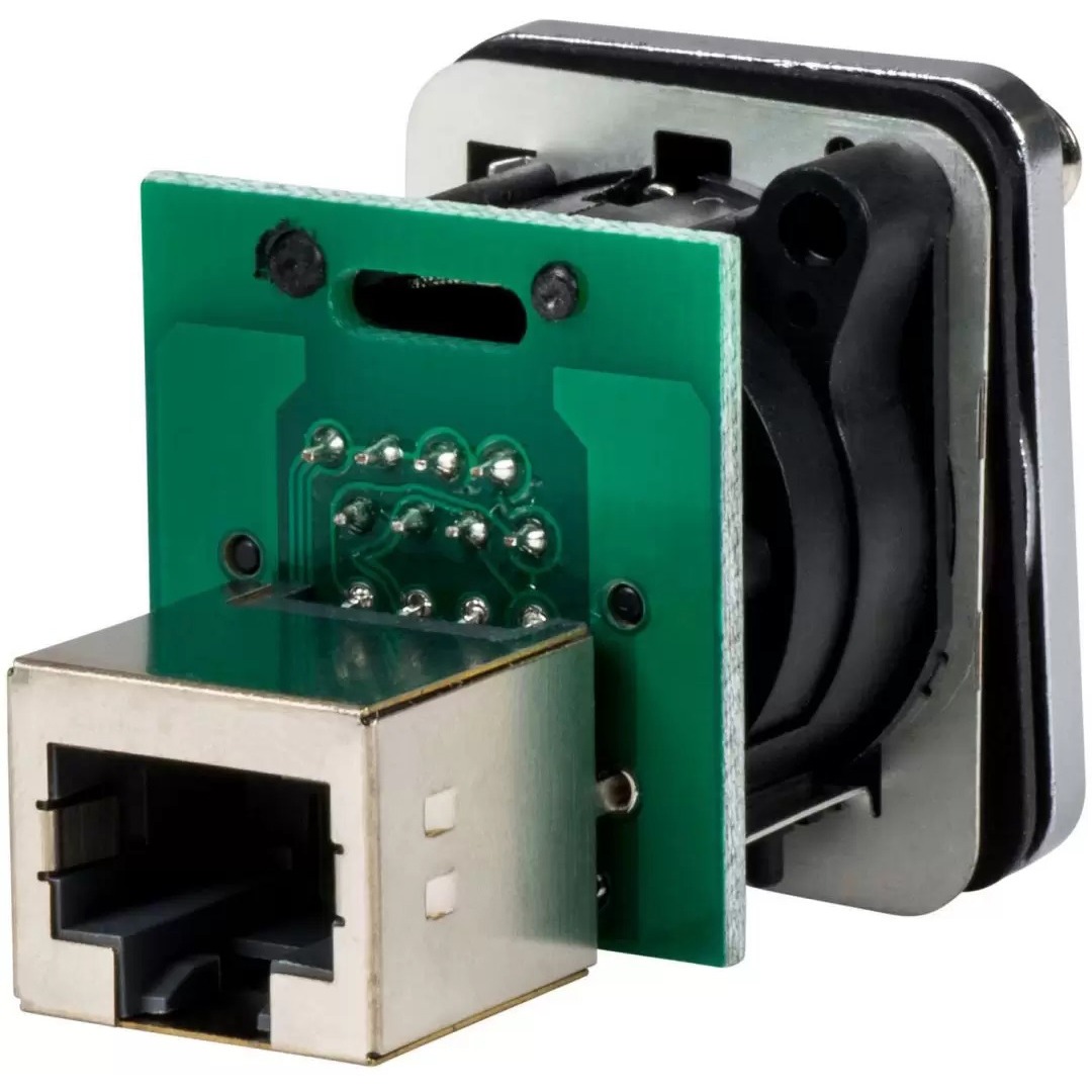 Neutrik NE8FDP-SE - Профессиональный панельный 8-ми контактный разъем RJ45 мама, толщина панели 2-4 мм, подключение с помощью прямого разъема, позолоченные контакты, монтаж спереди или сзади панели, металлический корпус. Разъем для установки кабеля RJ45, в комплекте с уплотнительным комплектом SE8FD, металлическим разъемом D-образной формы с замком фиксатора, монтажные винты в комплекте. Серия EtherCON - это надежная соединительная система для RJ45, оптимизированная для профессиональных аудио, видео и интернет сетей. Разъемы шасси имеют форму, чтобы вписаться в стандартизованные панели музыкальной и домашней индустрии. D-Series предлагает самый прочный дизайн серии etherCON и идеально подходит для панельного монтажа.