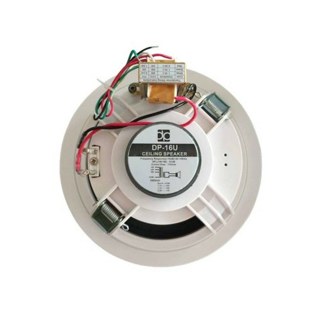 Direct Power Technology DP-16U 6 это потолочный громкоговоритель, оборудован встроенным трансформатором 70 В / 100 В, позволяющим снизить потери аудиосигнала в длинных линиях и облегчить параллельную коммутацию нескольких устройств. Встроенный динамик 6” обеспечивает воспроизведение сигнала в широком частотном диапазоне от 80 Гц до 16 кГц, а наличие нескольких отводов, 3 Вт, 6 Вт и 9 Вт, позволяет адаптировать громкоговоритель к использованию в помещениях с различными габаритами и уровнем окружающего шума. Металлическая сетка и корпус из пластика АБС окрашены в привлекательный белый цвет. Надежная и быстрая установка громкоговорителя осуществляется с помощью пружинного зажима. Эта модель является идеальным выбором для озвучивания сооружений промышленного и коммерческого назначения, а также гостиниц, школ и аналогичных объектов, где предполагается воспроизведение фоновой музыки и речевых сообщений.