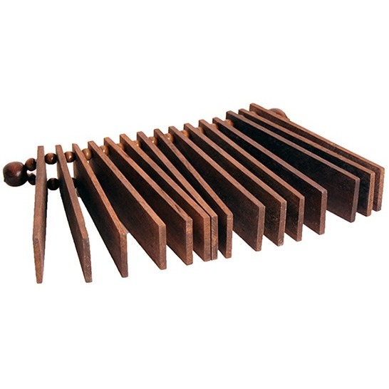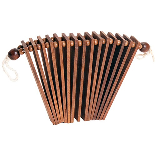 На трещотке играют двумя способами. Первый из них заключается в том, чтобы держать корпус трещотки неподвижно и крутить ручку. В этом случае получается спокойное стрекотание. При игре вторым способом корпус трещотки сильным взмахом заставляют вращаться, извлекая резкий и пронзительный звук. На Руси трещотки использовались при исполнении песен и плясок, а также в свадебных обрядах, чтобы отогнать злых духов от молодых.Данная модель сделана из дерева, представляет собой прямоугольную пластину с выемками, в которые помещена шестеренка, прикрепленная к удобной ручке. Трещотка проста и легка в обращении, подойдет для игр с детьми.