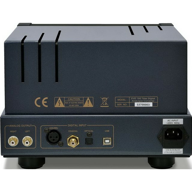 EVO 100 Tube DAC это цифро-аналоговый преобразователь в линейке EVO компании PrimaLuna. Особенность ЦАПа заключается в применении лампового тактового генератора SuperTubeClock, в котором используется миниатюрный электровакуумный триод российского производства с увеличенным сроком службы. Согласно информации производителя, SuperTubeClock обеспечивает предельно низкий уровень помех в наиболее важной для обеспечения качественного звучания полосе частот и значительно понижает джиттер, что в итоге выражается в улучшении переходных характеристик, правильном тональном балансе, а также в четком, чистом и динамичном звучании с высоким разрешением и детальностью. Для конвертации «цифры» в «аналог» задействован чип TI (Burr-Brown) PCM1792A, поддерживающий форматы PCM до 24 бит/192 кГц и DSD128. В конструкции также предусмотрен апсемплер TI (Burr-Brown) SRC4192, поднимающий разрешение сигнала до 24 бит/192 кГц.