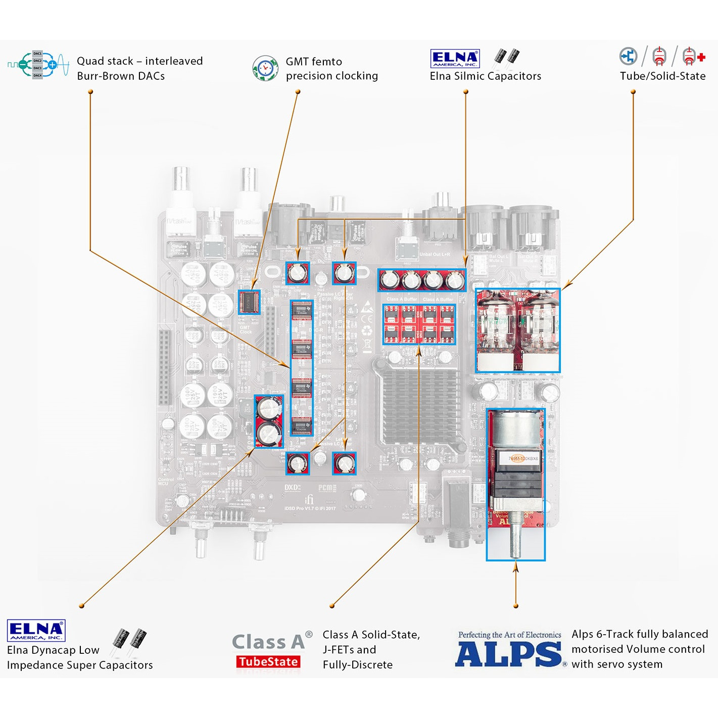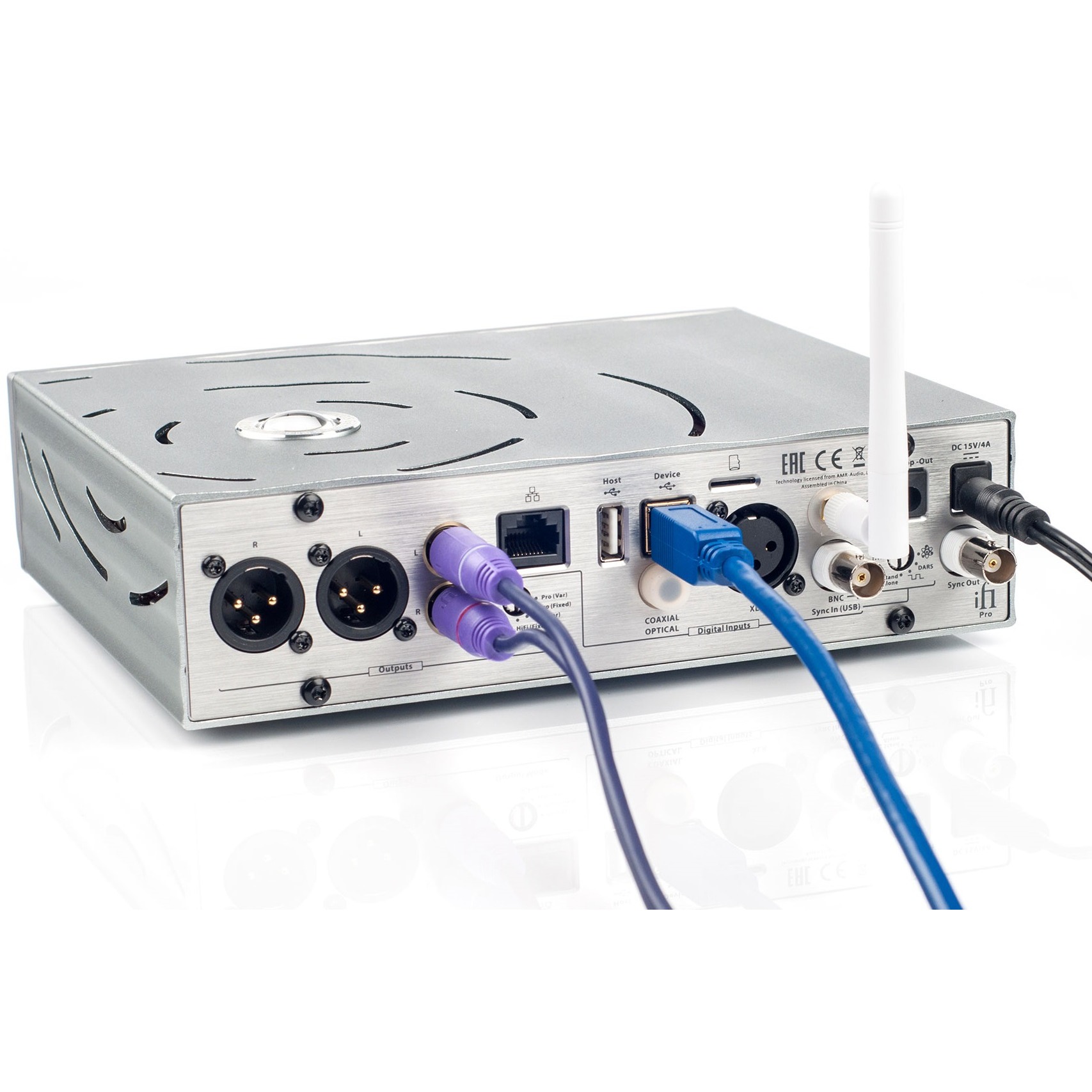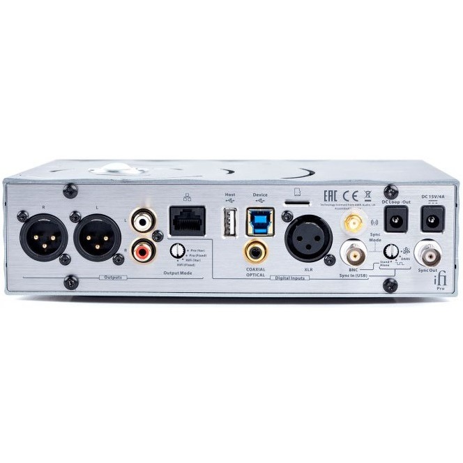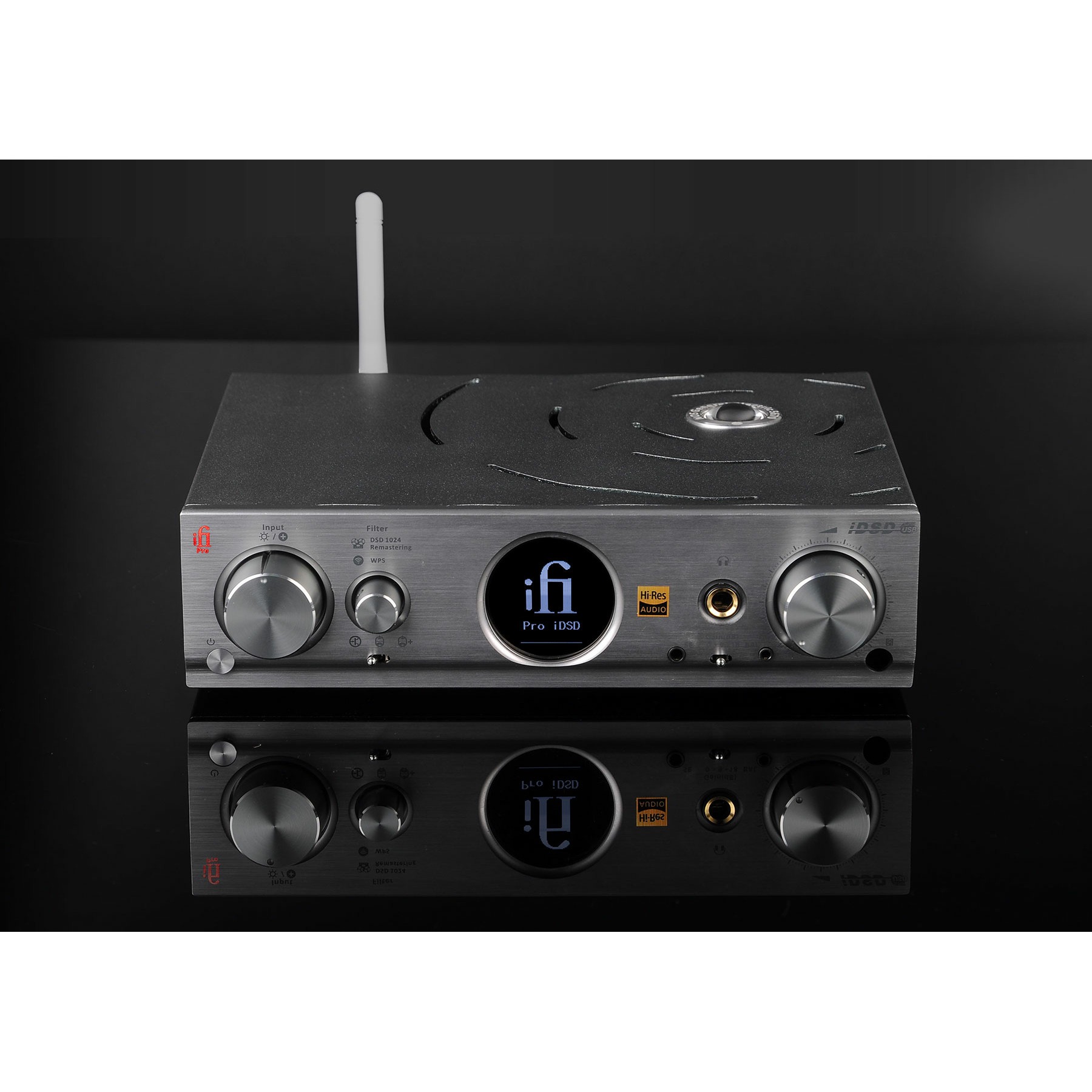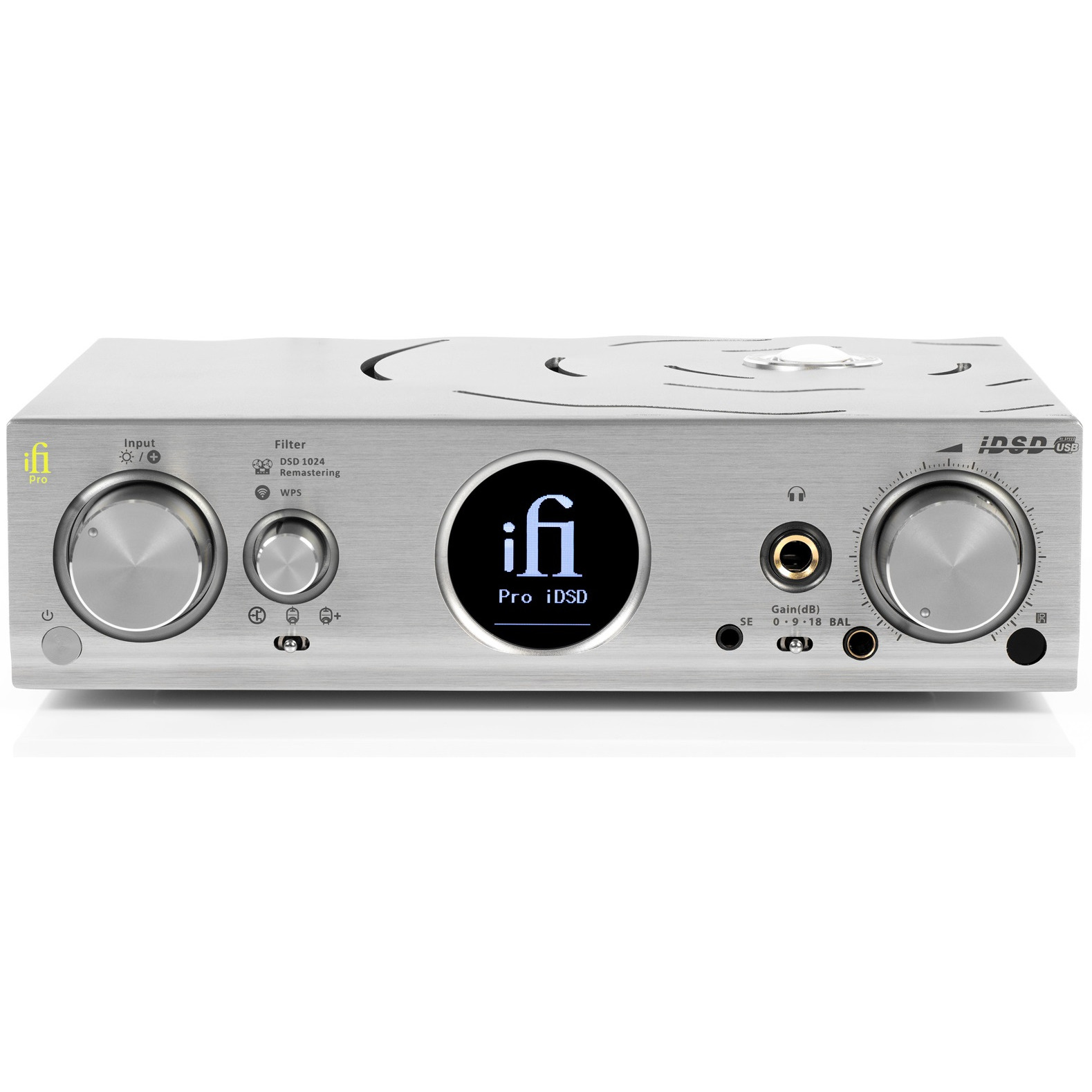 Флагманский источник британской фирмы iFi Audio Pro iDSD совмещает в себе функционал ЦАПа, предварительного усилителя, усилителя для наушников и сетевого стримера. И всё это — в габаритах 213 x 220 x 63,3 мм. Однако главное в нем не компактные размеры, а устремленность в будущее. Устройство способно работать с потоками PCM до 768 кГц и DSD до 49,152 МГц (DSD1024), а также DXD и 2xDXD. И это при том, что на данный момент коммерчески доступны записи максимум в DSD256. Аппарат построен на FPGA-движке Crysopeia, а значит перечень поддерживаемых им форматов может в будущем расширяться и пополняться.