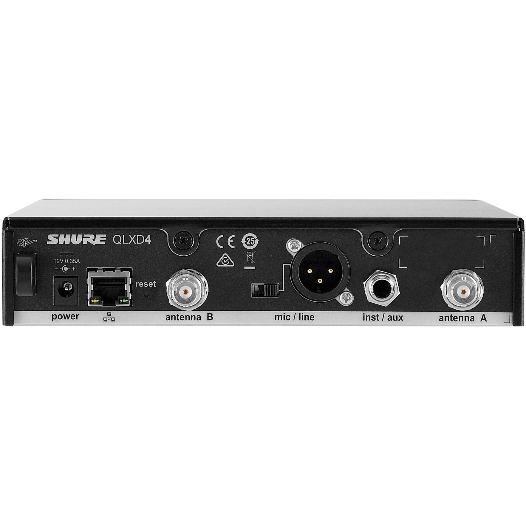 Ресивер QLXD4 сделан в полностью металлическом корпусе полурэкового формата, за счет чего может быть компактно установлен в рэковый модуль. Пара таких устройств занимает место корпуса 1U. Для сверхточного приема звука прибор оснащен двумя съемными антеннами, входы для которых представлены разъемами BNC. Антенны можно установить на дистанции для достижения еще более точного приема аудиосигнала с помощью кабелей длиной 60 см и держателей, которые поставляются в комплекте. Присутствуют функция автоматической синхронизации с трансмиттером и возможность установки до 70 совместимых систем. Выбранные настройки отображаются на встроенном ЖК-дисплее, а управление происходит с помощью нескольких клавиш на лицевой панели. Подключение к микшерному пульту или акустической системе осуществляется посредством выходов на разъемах XLR (микрофонный или линейный) и 1/4" Jack TRS (инструментальный или вспомогательный). В наличии также имеется порт Ethernet, служащий для удаленного управления с использованием приложения ShurePlus для платформы iOS и Wireless Workbench 6 для Windows. Энергообеспечение происходит от адаптера на 12V DC.