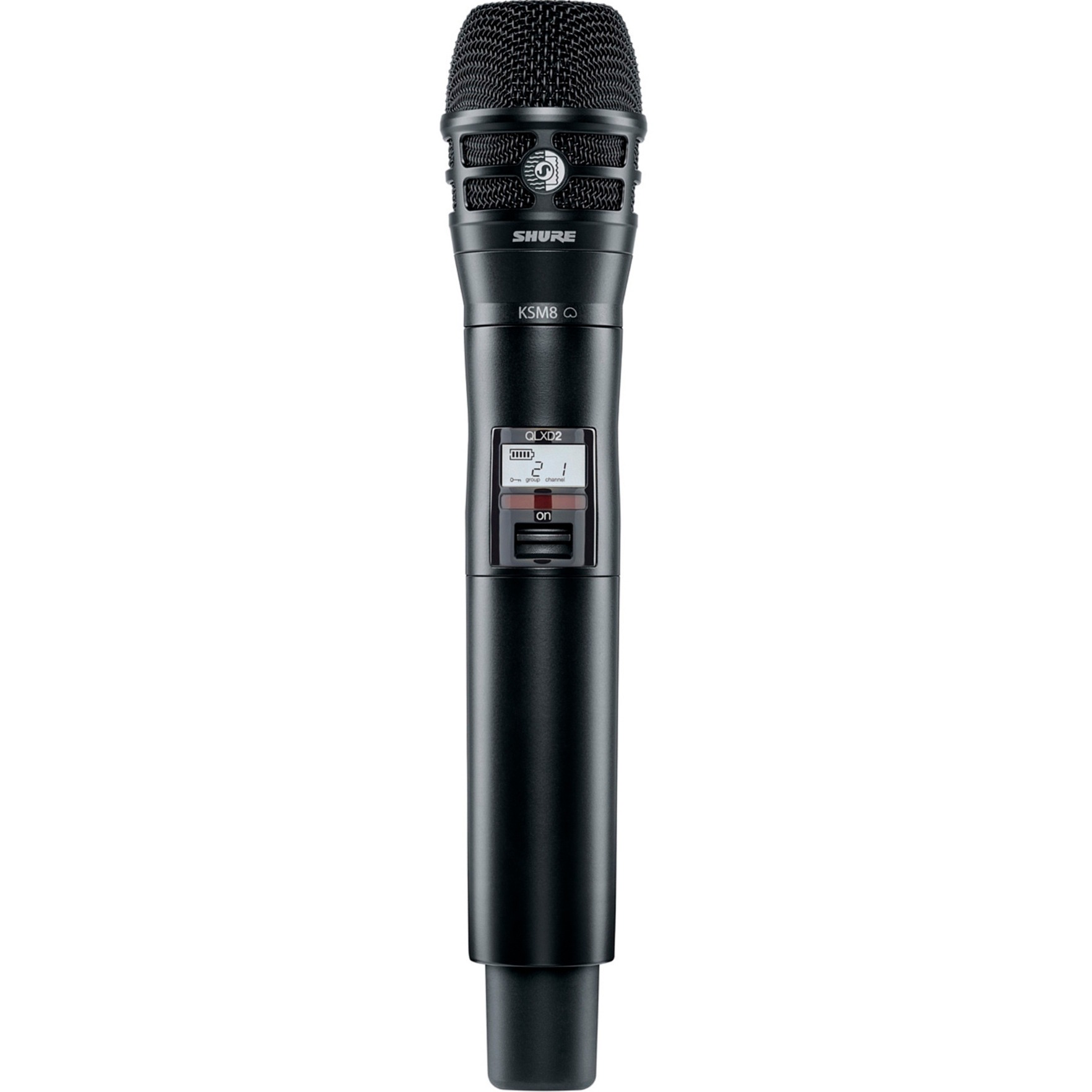 Ручной трансмиттер QLXD2 также сделан в стальном корпусе со встроенным ЖК-дисплеем, отображающим выбранную частоту, номер канала и остаток зарядки. Прибор имеет съемный микрофонный конденсаторный капсюль KSM8 с двумя диафрагмами, пассивной и активной. Такой тип микрофона обеспечивает прямую АЧХ и насыщенное звучание, что дает возможность использования практически в любых инсталляциях от громких концертов до студийных записей. Кардиоидная диаграмма направленности также способствует чистому и разборчивому звучанию, поскольку подавляет шумы сзади и по сторонам от капсюля, оставляя лишь рабочую зону перед ним. Уровень максимального звукового давления может достигать отметки 139 дБ, а озвучиваемый частотный диапазон лежит в спектре от 40 Гц до 16 кГц. Выходную мощность позволяется переключить с 1 на 10 мВт в зависимости от типа и условий размещения. Питание осуществляется от двух батареек типа АА или от заряжаемого литий-ионного аккумулятора Shure SB900A, который приобретается отдельно. Время работы от батареек до 9 часов, а от аккумулятора – до 10.