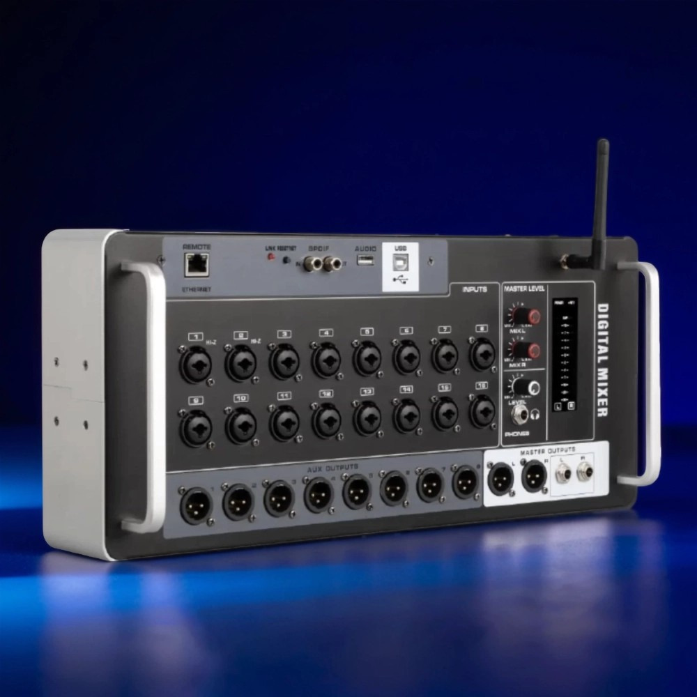 Цифровой микшерный пульт с 16 аналоговыми входными каналами. Устройство подходит для профессионального использования в студиях, на концертных площадках и в других ситуациях, где требуется обработка аудиосигнала.