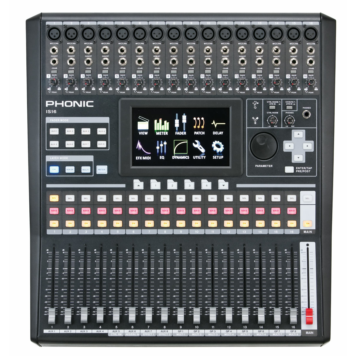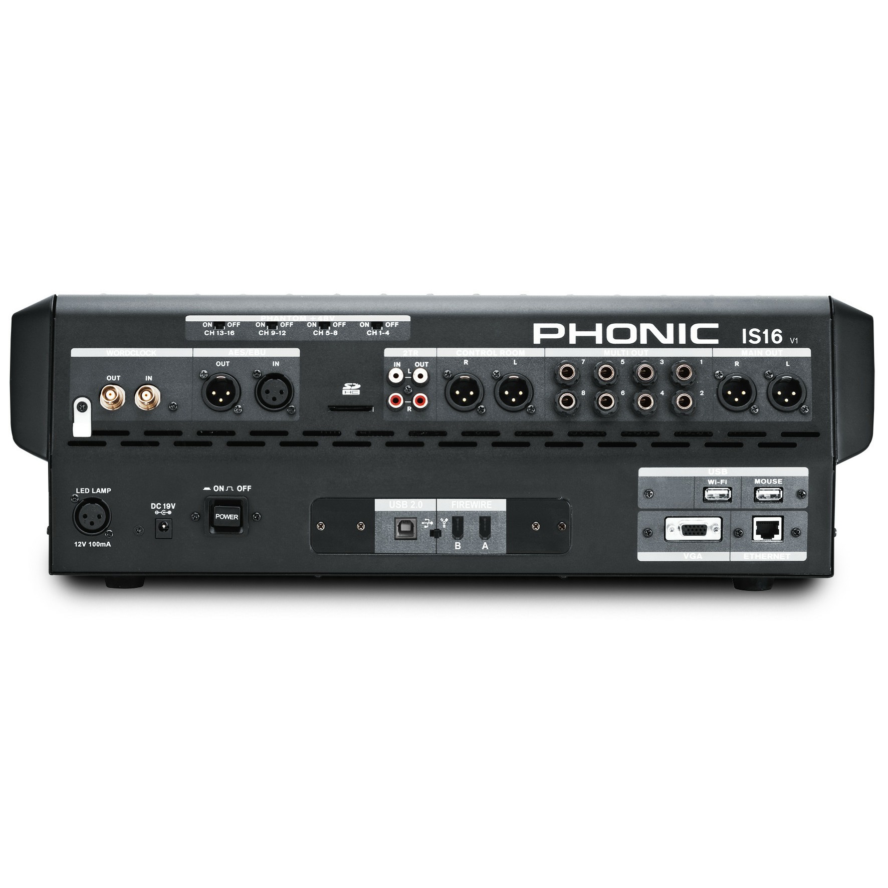 Встроенный выходной VGA разъем обеспечивает функциональность для комфортного просмотра на любом современном мониторе компьютера. Интерфейс USB/FireWire позволяет подключать PC и Mac через USB 2.0 и FireWire соединения. Если учесть такие встроенные функции, как: EQ, dynamic, delays, digital effects, signal generator и meter bridge, то становится понятно, что Phonic IS16 – это не какой-нибудь посредственный микшер . IS16 достаточно мощный, чтобы использовать его в качестве основного микшера для живого звука, сценического - мониторного или для профессиональной студийной записи.