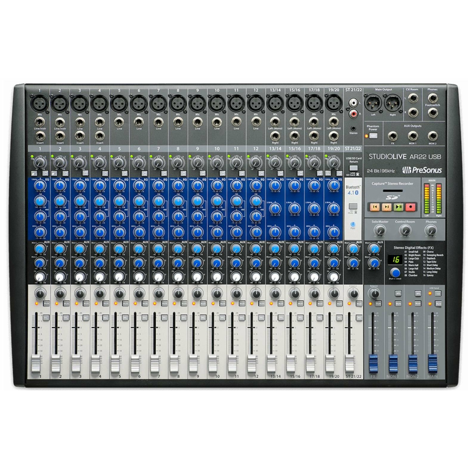 PreSonus StudioLive AR22 USB – универсальный многоканальный цифровой микшер, который подойдет для студийного использования, применения на сцене или на репетиции. Предусмотрено 22 входных канала, 16 микрофонных усилителей, процессор стереоэффектов, встроенный Bluetooth, аудиоинтерфейс USB 24 бит/96 кГц и SD-рекордер, подходящий для записи стереомиксов и воспроизведения файлов в MP3/WAV-форматах. Также сделана тесная интеграция с входящими в комплект программами Studio One 3 Artist и Capture.