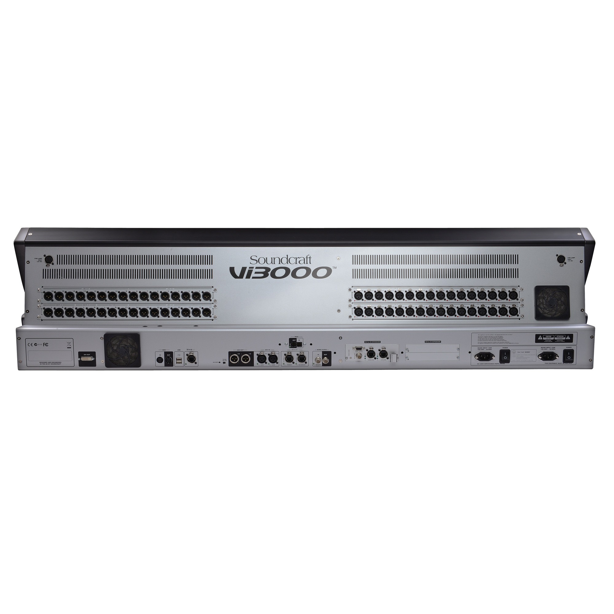 Благодаря наличию 4 экранов за этой мощной консолью могут работать сразу 2 инженера одновременно. SOUNDCRAFT VI3000 обладает большими коммутационными возможностями, которые представлены на задней панели в виде интерфейсов и соединительных коннекторов. Помимо полного набора аналоговых и цифровых входов и выходов, консоль оборудована MIDI, Ethernet, USB, выходами Dante/Madi,DVI выходами, встроенным блоком питания с резервированием, а также некоторыми другими разъёмами.