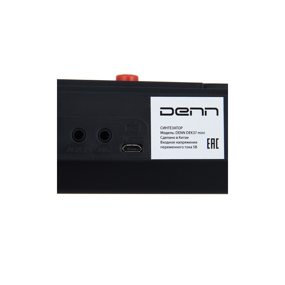 Дополняют конфигурацию устройства вход для микрофона и 1 динамик. Вес синтезатора Denn DEK37mini составляет всего 750 г. Несмотря на малый вес и компактные размеры, синтезатор является полноценным устройством для обучения музыке.