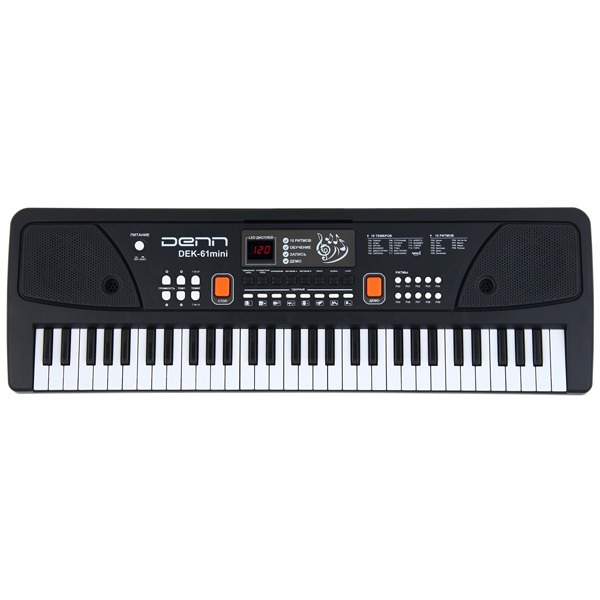 Устройство имеет синтезаторную механику и невзвешенную клавиатуру. Малоразмерные клавиши удобны для детских пальчиков. Также стоит отметить 16 общих тембров и 10 стилей автоаккомпанемента. В конструкции синтезатора имеется функция обучения и секвенсор с 6 предустановленными композициями. Один выход на наушники (jack 6.3 мм) и 2 динамика дополняют конструкцию синтезатора. Вес Denn DEK61mini – всего 1 кг, что делает его особенно удобным для использования ребенком.