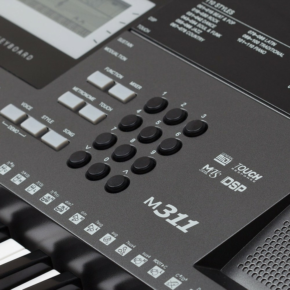 Клавиатура синтезатора Medeli M311 признана одной из самых удобных в линейке бюджетных инструментов. Она, прежде всего, состоит из 61 клавиши и имеет точные динамические характеристики - т.е. динамика звучания напрямую зависит от скорости и силы нажатия на клавишу.