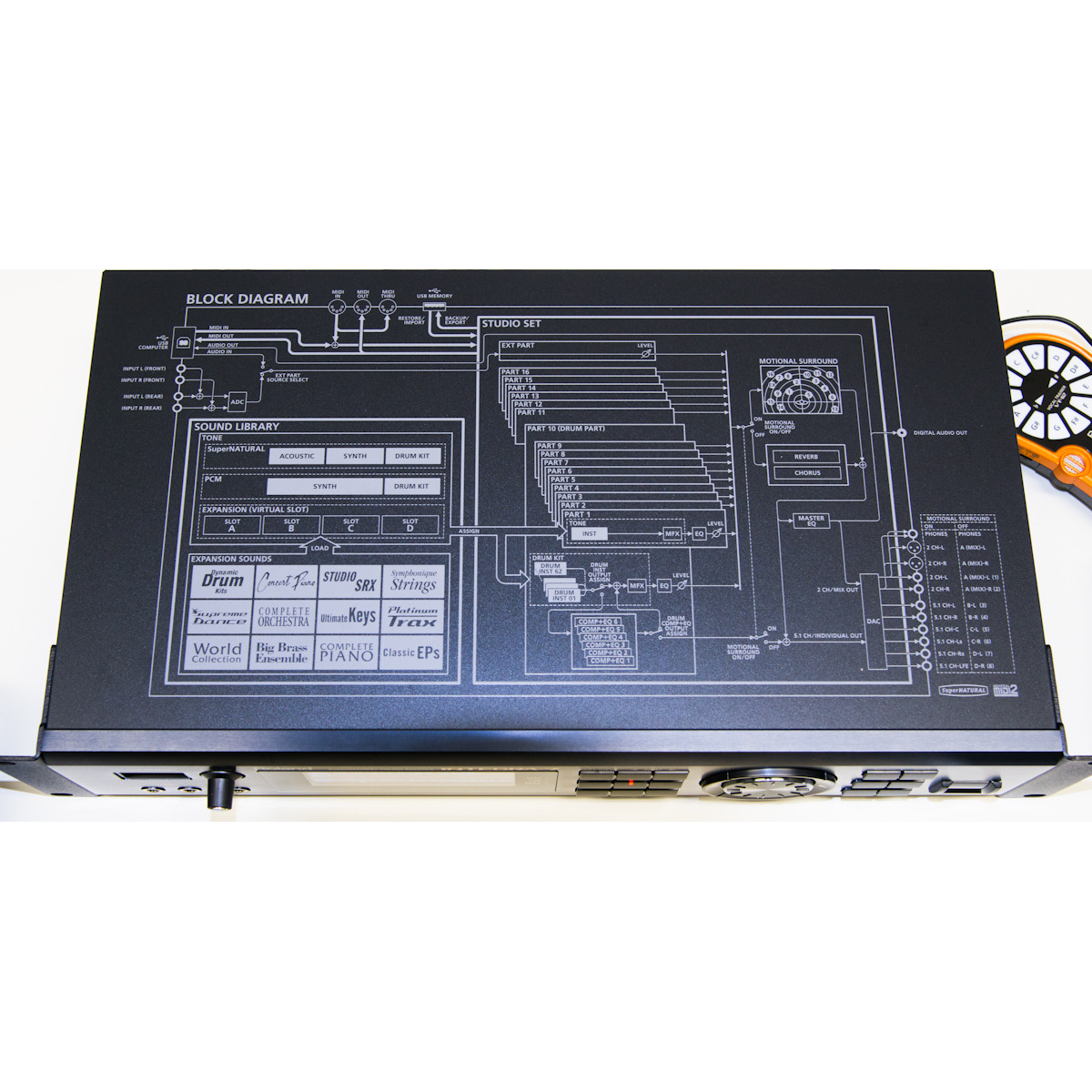 INTEGRA-7 имеет более 6,000 встроенных звуков, охватывающие все стили музыки. Чтобы иметь такой эквивалент на компьютере вам необходимо несколько программных синтезаторов, огромное количество оперативной памяти и мощный процессор. Каждая категория INTEGRA-7 забита огромным количеством звуков - от создания музыки до фильмопроизводства, от акустических инструментов фортепьяно, духовых, ударных, струнных до этнических инструментов Азии, Африки и Дальнего Востока. Также присутствует огромное количество эффектов для вашей композиций и саундтреков. Для достижения большей глубины и пространственности активируйте технологию Motional Surround и наслаждайтесь звуком.