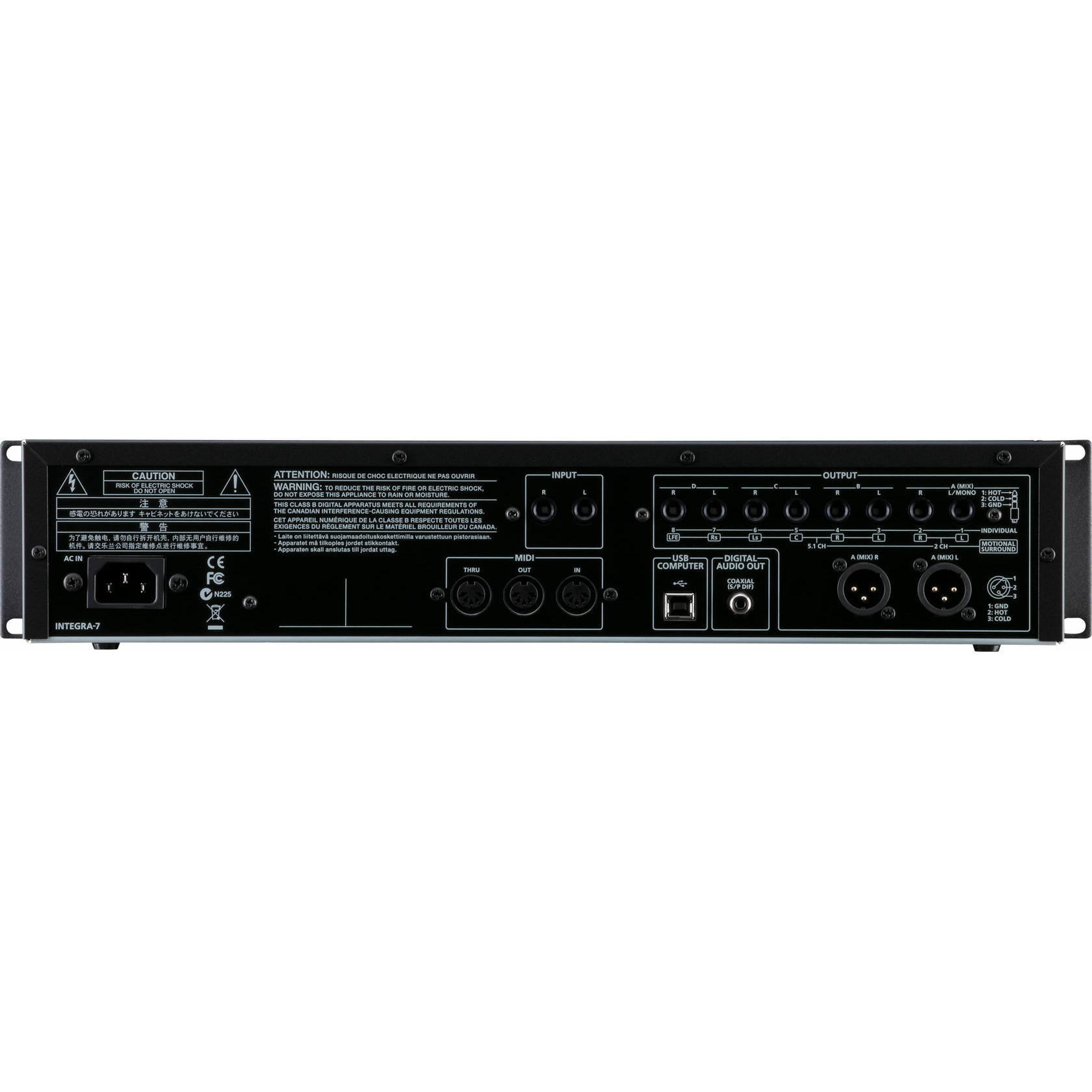 Задняя панель оснащена огромным количеством входов и выходов: стерео XLR выход, восемь индивидуальных выходов 1/4 джек, цифровой (коаксиальный) выход, MIDI in/out/thru и USB порт, поддерживающий потоковое аудио до 24-бит/96 кГц. Для удобства и производительности аудио вход имеется, как на передней так и на задней части модуля.