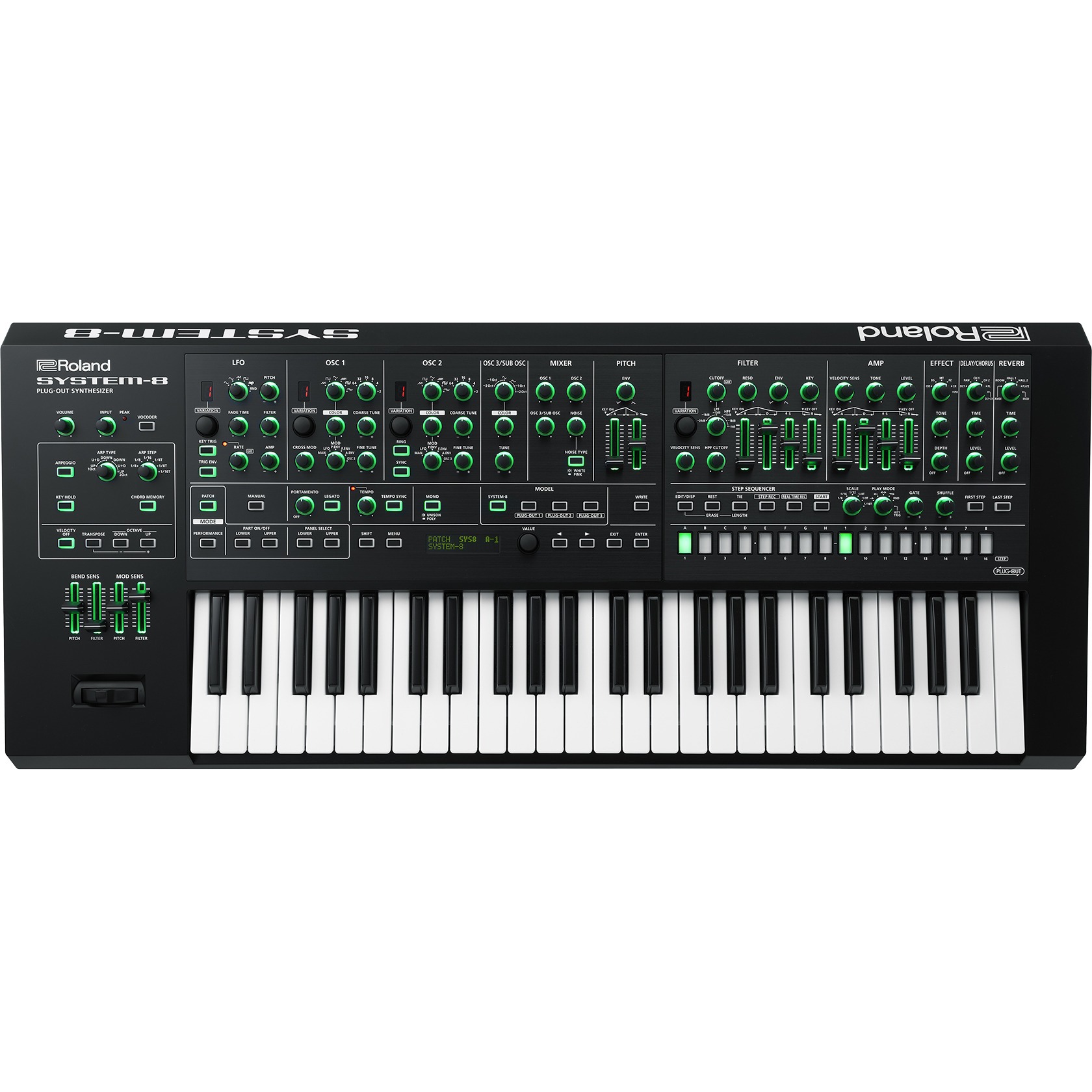 Мощный синтезатор SYSTEM-8 с хорошо продуманной архитектурой предоставляет широчайшую палитру звуков, являющихся основой для создания легендарных синтезаторов Roland на протяжении более 40 лет. Архитектура нового поколения на основе моделирования аналоговой схемотехники (ACB) предлагает 8-голосную полифонию, 3 генератора с фильтрами и эффектами, универсальные LFO, а также множество высокоточных энкодеров и слайдеров для управления всеми этими возможностями. Поддержка работы трех моделей синтезаторов PLUG-OUT говорит о том, что SYSTEM-8 способен воссоздавать звучание множества классических моделей компании Roland, причем программные синтезаторы JUPITER-8 и JUNO-106 уже входят в комплект поставки (*). С помощью разделения и наложения синтезаторов можно создавать бесконечное множество звуков, а в совокупности с встроенными вокодером, арпеджиатором, выходами CV/Gate и усовершенствованным полифоническим пошаговым секвенсером возможности инструмента становятся воистину фантастическими.