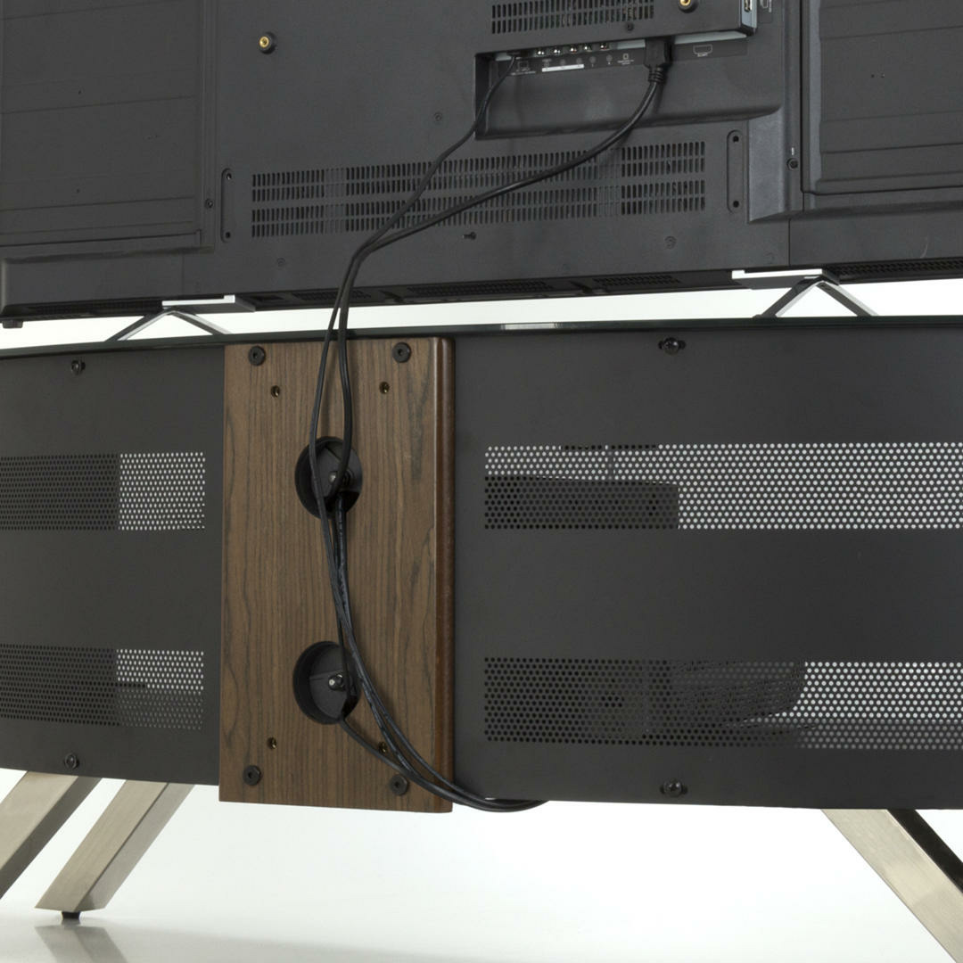 Полностью новая металлическая задняя панель позволяет присоединить монтажный стол AVF к задней панели и подвешивать телевизор над стойкой. Таким образом, вы получите больше места, не просверлившись в стене. Кроме того, поскольку эта задняя панель хорошо вентилируется, ваш комплект будет оставаться прохладным, а аудио, от звуковых баров, может свободно циркулировать.