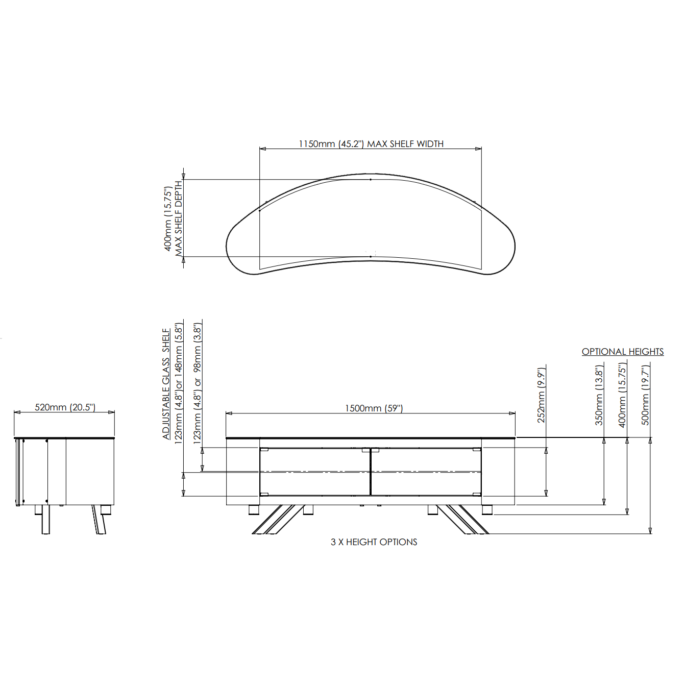 У данной модели три варианта ножек (все варианты идут в комплекте) разной высоты (50см/40см/30см), которые помогут вам получить лучший угол обзора. Так же на задней стенке тумбы находится кабель-канал. Таким образом, вам не будут мешаться кабели и портить вид.